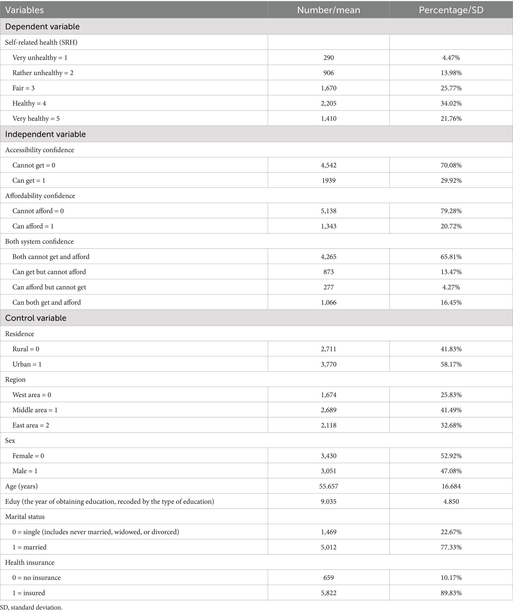 The control variables in this study were demographic characteristics, including age, sex, education, and marital status. Furthermore, we controlled for health insurance and area (urban and rural, western, middle, and eastern regions) to minimize the confounding effects of other socioeconomic factors. The definitions, assignments, and descriptive statistics of the variables are presented in Table 1.