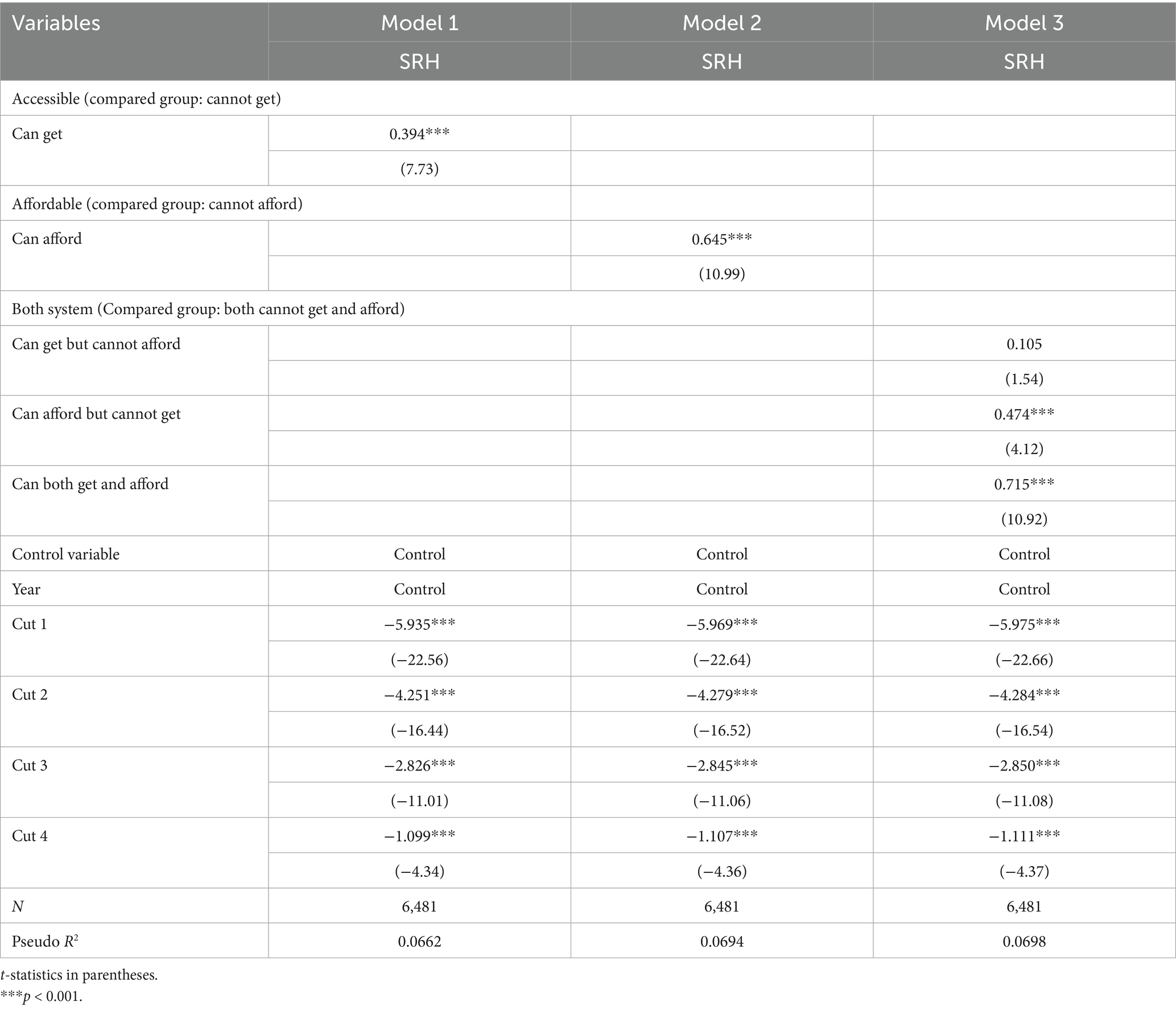 As the SRH is an ordered variable from 1 to 5, this study employed ordered logistic regression to examine the relationship between health system confidence and health status Based on the definition of health system confidence, we set the heath accessible system confidence dummy [cannot get(compared group) or can get], heath affordable system confidence dummy [cannot afford(compared group) or can afford], both system confidence dummy [both cannot get and afford(compared group), can get but cannot afford, can afford but cannot get, can both get and afford] as three separate independent variables (Model 1 to Model 3). All the models contained control variables and year effects. The key findings are presented in Table 2.