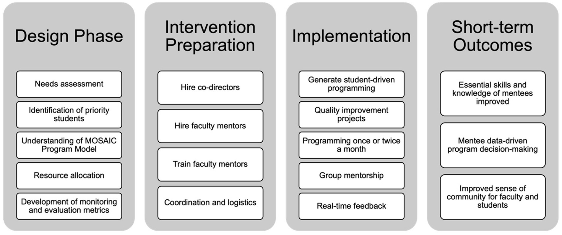 MOSAIC was developed through a collaborative, student-centered process that included faculty and student input to ensure the program addressed real and perceived barriers in public health mentorship. The implementation of the MOSAIC program at Columbia University in 2019 involved a structured, multi-phase approach, encompassing four main stages: the design phase, intervention preparation, implementation, and short-term outcomes (Figure 1).