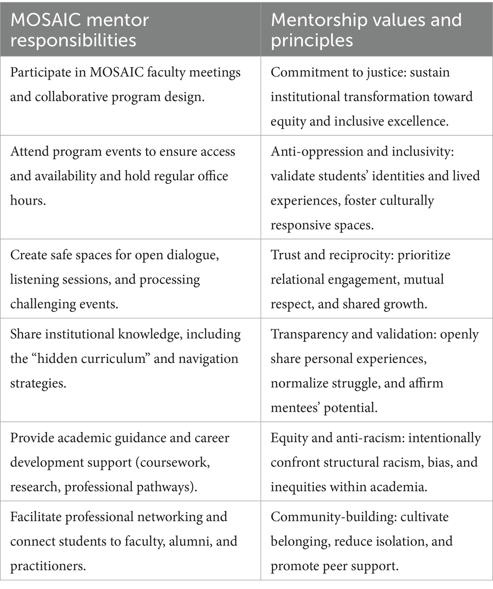 Although the case has been made that mentors can be and have been effective even with mentees whose racial backgrounds differ from their own, the amount of time, effort, dedication, and knowledge, and skill it takes to be effective mentors with mentees who are already isolated in PWIs is quite high. Thus, mentors, often, do not have the requisite training to provide URM mentees with the kind of mentorship needed to navigate racial barriers and thrive in an isolating academic environment (33). Studies show that mentoring program practitioners should elevate their communication with mentees, either directly or through mentors, to learn more about the mentee experience and their dispositions toward mentoring (34). Thus, MOSAIC intentionally includes faculty of color or first-generation faculty and compensates faculty for their involvement as faculty mentors.