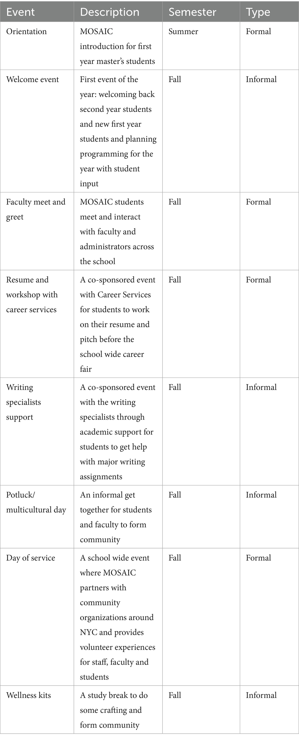 Community building is another critical aspect, as MOSAIC fosters a sense of belonging through cohort-based mentorship, social events, and peer support networks. To help students successfully navigate institutions, the program provides structured guidance on coursework, research, administrative processes, and funding opportunities. Professional development is prioritized through tailored workshops, guest speaker panels, and skill-building sessions to prepare students for careers in public health. A sample semester schedule of events can be found in Table 2 and demonstrates the mix of formal and informal events that we put together each semester.