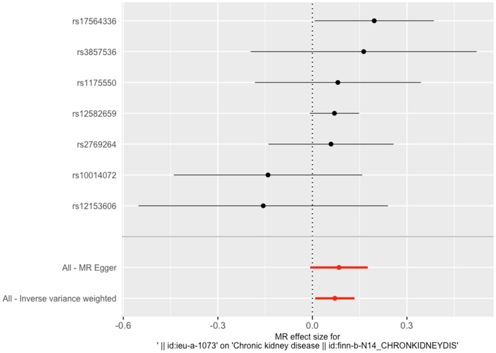 The IVW results indicated that a one SD increase in genetically predicted serum copper levels was associated with a 5.8% higher risk of CKD (odds ratio (OR) = 1.058, 95% confidence interval (95% CI): 1.008–2.57, p = 0.005). Although the MR-Egger, weighted median, simple mode, and weighted mode analyses did not yield statistically significant results (p > 0.05), all methods showed a consistent positive association trend (all OR > 1; Table 1; Figure 1). The forest plot illustrates there was 1 SNP (rs17564336) associated with CKD, and the overall causal estimates derived from the IVW method (highlighted in red) suggested a potential causal relationship between the genetic variants and CKD (Figure 2). Furthermore, the leave-one-out analysis presented in the forest plot showed the error line is consistently positioned on right side of the x-axis at zero, indicating minimal overall variation (Supplementary Figure S1). Funnel plot illustrated the SNPs are approximately uniformly distributed around the IVW or MR Egger lines (Supplementary Figure S2). Taken together, the leave-one-out analysis supports that the MR results are robust.