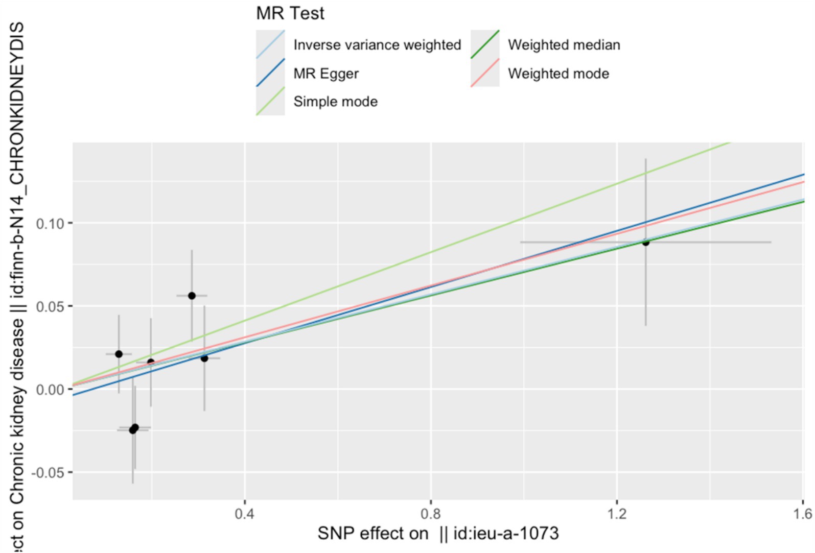 Figure 1. Effects of SNP on serum copper levels and CKD risk. Each data point on the plot corresponds to an instrumental variable single-nucleotide polymorphism (SNP). The lines extending from each point represent the 95% confidence intervals. The horizontal axis quantifies the effect of each SNP on the exposure factor, copper, while the vertical axis measures the impact of each SNP on the outcome, chronic kidney disease (CKD). The slope of the colored lines, differentiated by color to represent various algorithms, indicates the ratio of these two effects—reflecting the influence of copper on CKD. The consistent upward trajectory of these lines suggests a positive cor-relation between increased copper and a higher risk of CKD.