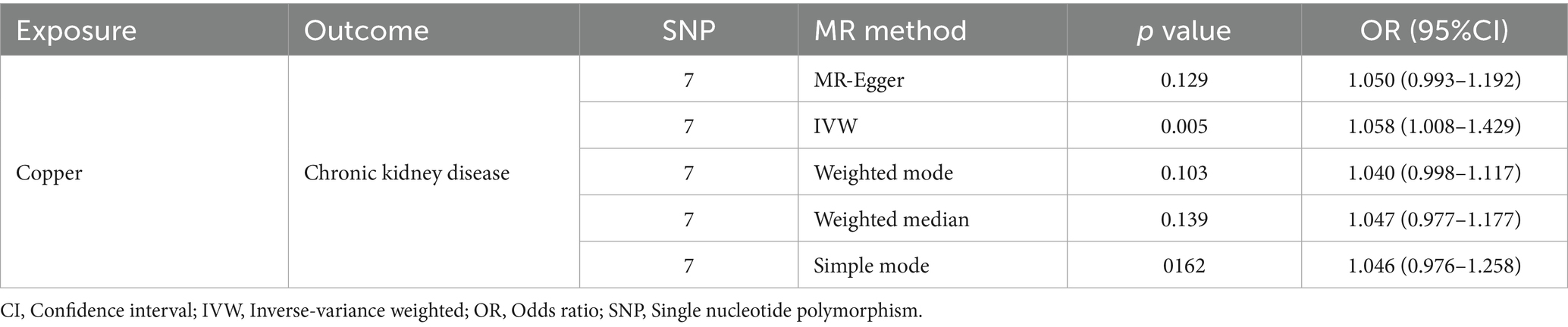 MR is a powerful approach that employs genetic variation as an instrumental variable to assess causal relationships, allowing for better control of confounding factors and reverse causality. This method thus facilitates a more accurate evaluation of the causal effects of exposures on outcome (25). So, this approach allows for a more precise evaluation of the causal effects of serum copper on CKD outcomes. MR has been recognized as a valuable tool in kidney disease research (26). Our findings align with the study conducted by Ahmad et al. (17), which also identified a potential genetic causal relationship between elevated copper levels and CKD. However, unlike our study, Ahmad et al. relied solely on genomic data from a meta-analysis of three cohorts, whereas we integrated genetic data with real-world clinical observations to enhance the robustness of our conclusions.