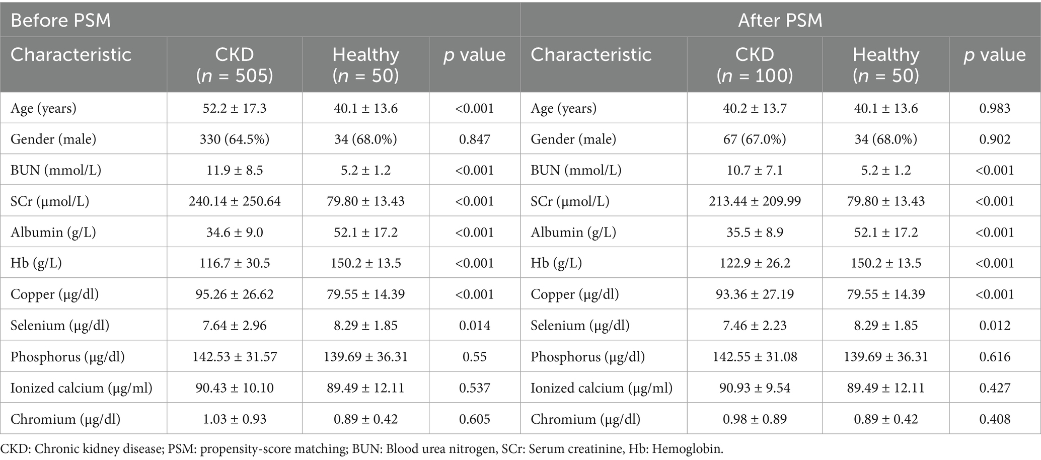 A retrospective study was conducted to validate the association between serum copper levels and CKD. The study included 505 CKD patients without dialysis admitted to the Department of Nephrology at Sichuan Provincial People’s Hospital between January 2021 and December 2022, along with 50 healthy volunteers serving as controls. The inclusion criteria were: (1) participants aged >18 years and (2) availability of trace element examination results. CKD diagnosis was based on the Kidney Disease Improving Global Outcomes (KDIGO) guidelines, defined as an eGFR <60 ml/min/1.73 m2 or a urine ACR ≥ 30 mg/g. CKD was staged into five categories according to KDIGO criteria (21). Exclusion criteria included pregnancy, serious infections, systemic diseases, or conditions such as severe malnutrition, cirrhosis, tumors, severe cardiovascular diseases, and hematopoietic or digestive system disorders.