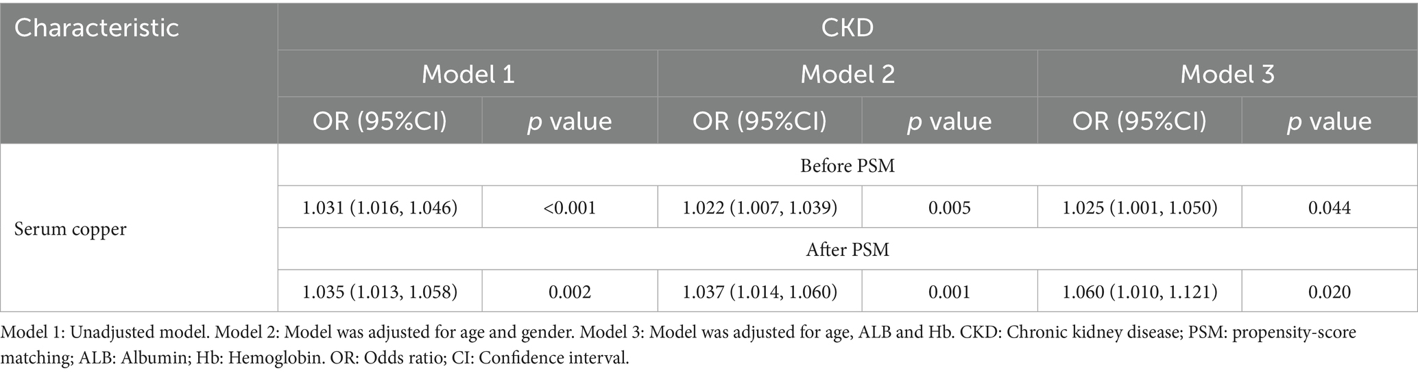 To address the observed age, albumin (ALB) and hemoglobin (Hb) differences between the CKD and control groups, serum copper levels were re-evaluated after adjusting for age, ALB and Hb. Even after correction, serum copper remained significantly elevated in CKD patients (p < 0.05) (OR (95%CI) = 1.025(1.001, 1.050), p < 0.05) (Table 3). Propensity-score matching (PSM) was applied to minimize potential biases. PSM process adjusted age and gender between the 2 groups for final analysis. In PSM subgroup, CKD group had a significantly elevated levels of serum copper and reduced selenium levels (Table 2). Multivariate logistic regression analysis showed serum copper remained a risk factor for CKD (OR (95%CI) = 1.060(1.010, 1.121), p = 0.020) (Table 3).
