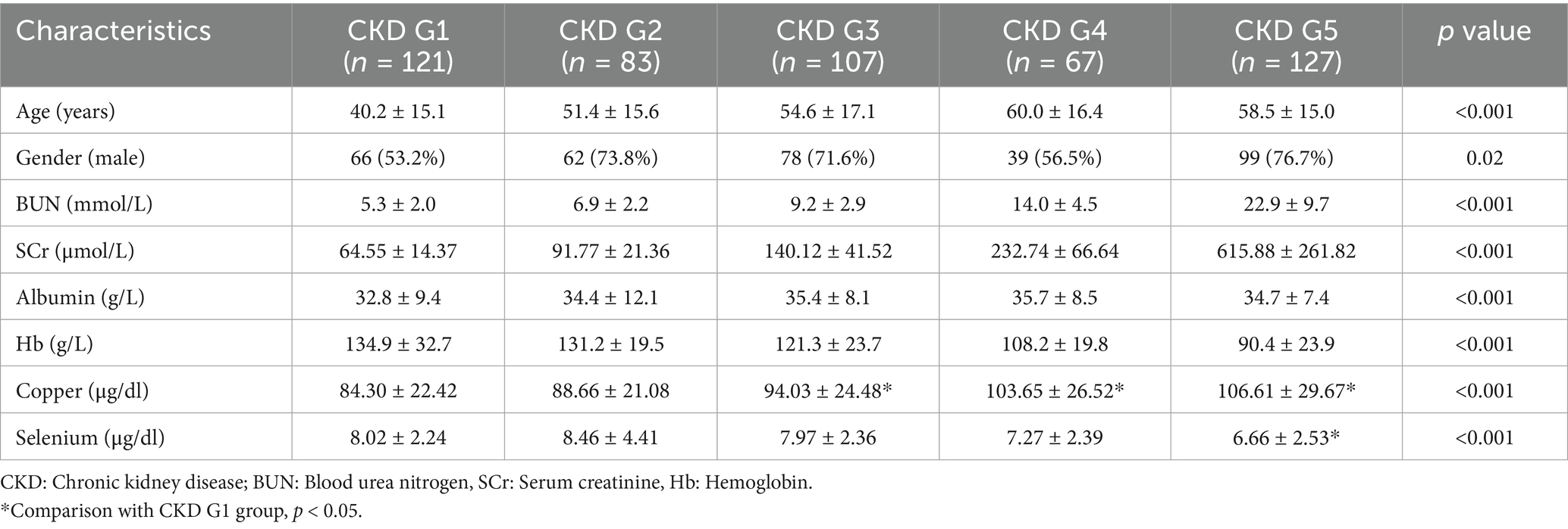 In our retrospective cohort analysis, we analysis baseline demographic data and serum trace element levels results from 505 CKD patients and 50 healthy controls. Our results revealed that serum copper levels were significantly elevated in CKD patients compared to the healthy individuals, corroborating previous studies conducted in older adult Chinese populations and rural communities in Bangladesh (13, 27). These findings suggest that elevated serum copper levels may serve as a potential risk factor for CKD. Moreover, we observed a progressive increase in serum copper levels as CKD advanced from stage 1 to stage 5, reinforcing the hypothesis that copper may play a critical role in CKD progression. Compared to previous studies (10, 12, 28–30) that focused on specific populations such as older adult individuals, occupational cohorts, or dialysis patients, this study is a retrospective study of patients with CKD and the inclusion of healthy controls, which allowed for a more robust analysis of the relationship between serum copper levels and CKD staging. The combination of existing researches and our results strengthens the case for copper may as a contributing factor to CKD progression, however, the mechanism of serum copper causes CKD is still unclear, which needs to be explored by further studies.