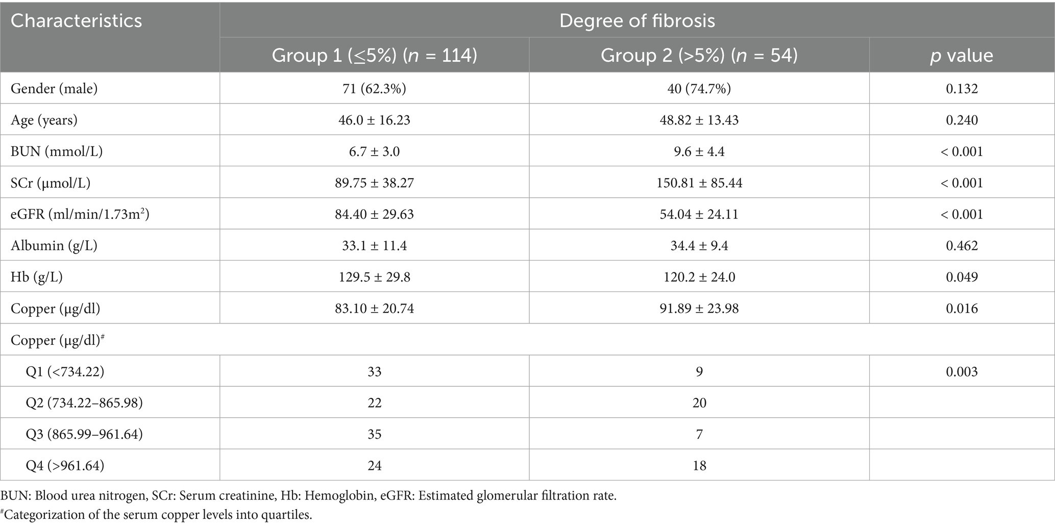 Of the 168 CKD patients who underwent renal biopsy were included in this analysis. The degree of renal fibrosis was evaluated using Masson staining and categorized into two groups: Group 1 (fibrosis ≤ 5%, n = 114) and Group 2 (fibrosis > 5%, n = 54). Baseline characteristics, including age, gender, and albumin levels, showed no significant differences between the two groups. However, patients in Group 2 (higher fibrosis) exhibited significantly elevated serum creatinine and blood urea nitrogen levels, lower eGFR, and reduced hemoglobin levels compared to Group 1, consistent with advanced CKD clinical manifestations. Importantly, these patients also had significantly higher serum copper levels (Table 6).