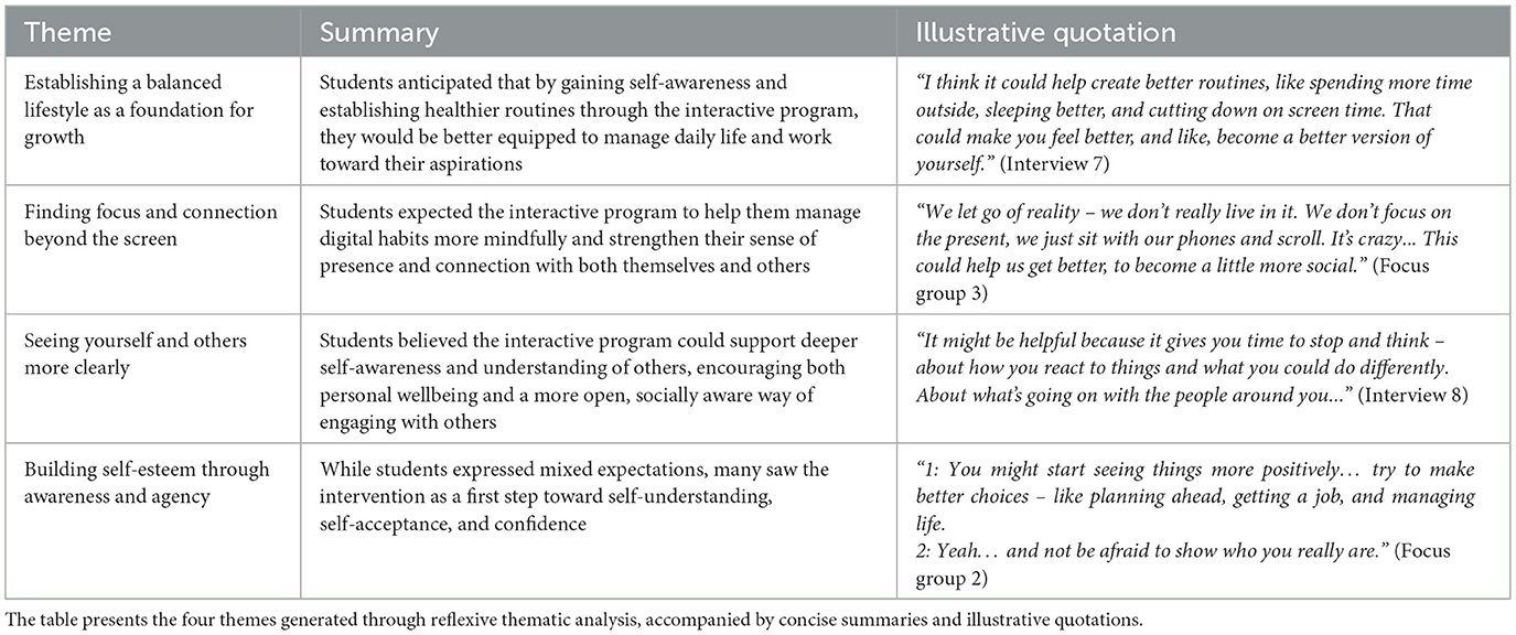 The reflexive thematic analysis generated four themes (Table 1) that reflect students' expectations of the interactive program On the Inside in relation to their mental health.