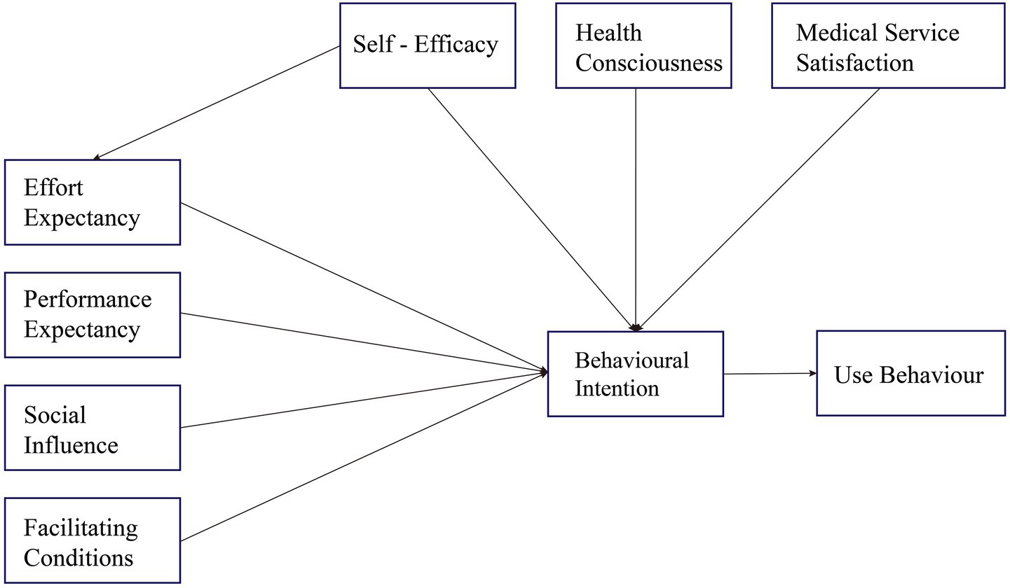 To address this research gap, the study extends the original UTAUT model by incorporating Health Consciousness (HC) to capture the intrinsic motivation for active health management, Self-Efficacy (SE) to assess confidence thresholds in technology use, and Medical Service Satisfaction (MSS) to explore how service quality and subjective experiences may impact technology adoption. This extension not only responds to the call by Martins et al. (19) to adapt technology adoption models to specific contextual needs, but also enriches the application of UTAUT in service system contexts by incorporating the service attributes of SPSS into the technology adoption framework. It reveals the unique pathways of technology adoption among the older adults in the context of Chinese culture, providing new theoretical perspectives for research on technology adoption by the older adults in developing countries. Additionally, it offers empirical evidence for the design optimization and promotional strategy formulation of intelligent medication management systems.
