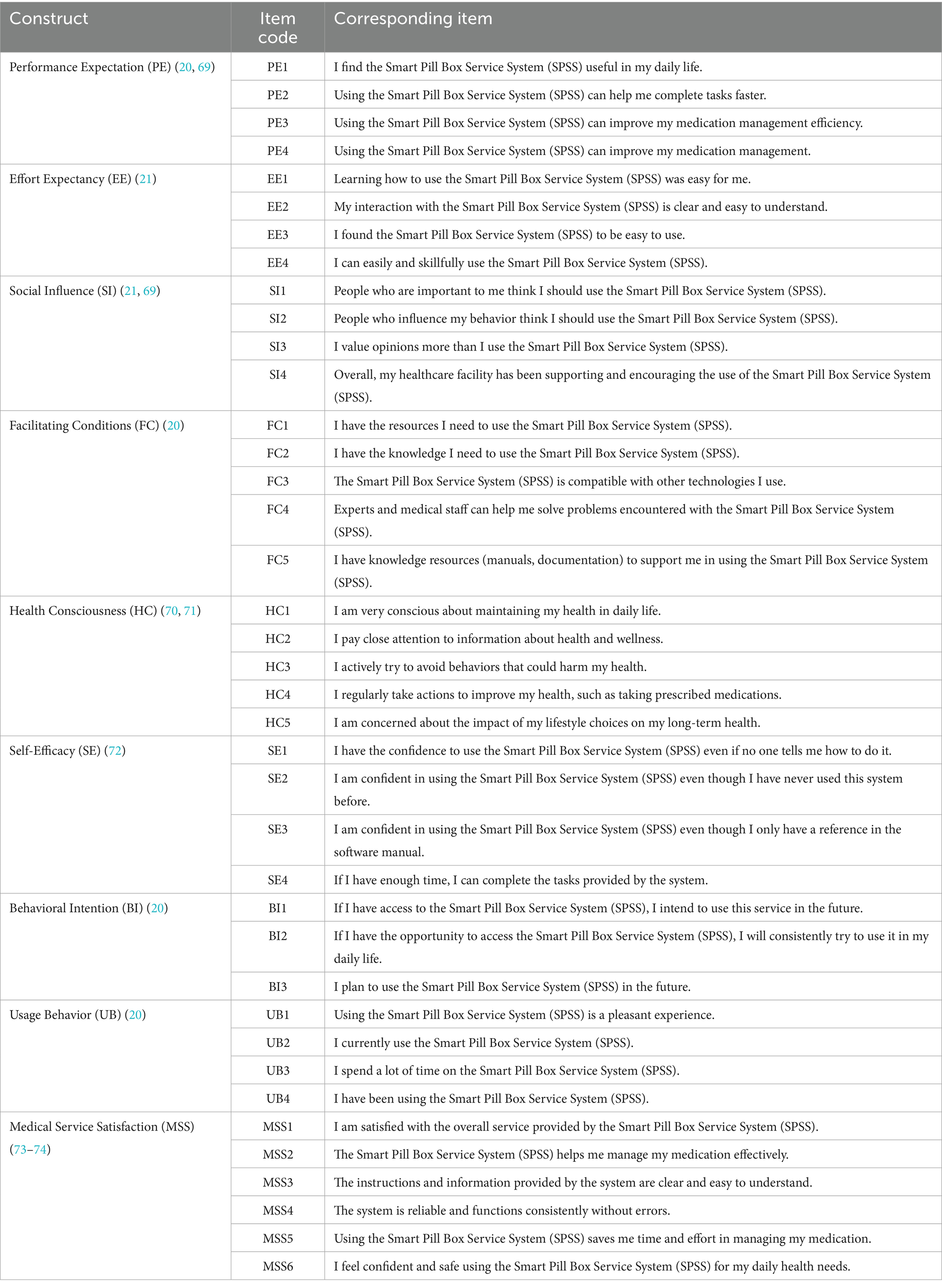 The Unified Theory of Acceptance and Use of Technology (UTAUT) has been widely adopted due to its broad applicability in predicting user behavior (9). In the healthcare domain, researchers have frequently applied the UTAUT model to examine the intention of medical professionals in developing countries to use e-health services (14). However, the majority of these studies have primarily focused on the technological utility of such systems or have adopted the perspectives of healthcare providers, rather than end-users. For example, Edo et al. (15) assessed the impact of digital health technologies on the healthcare industry and explored the factors influencing healthcare professionals’ adoption of digital technologies. Similarly, Diel et al. (16) investigated physicians’ acceptance of telemedicine for online consultations. Bunnell et al. (17) analyzed the acceptability of telemedicine through the characteristics of mental health professionals (18). These studies primarily focus on the adoption of emerging technologies by healthcare professionals, with limited attention given to the perspectives of older adult users. The existing research has not fully considered the service attributes of SPSS. The traditional UTAUT model primarily addresses one-time technology adoption decisions, whereas SPSS requires users to establish an ongoing service usage relationship, involving unique factors such as service quality perception, health status, and the establishment of sustained efficacy.