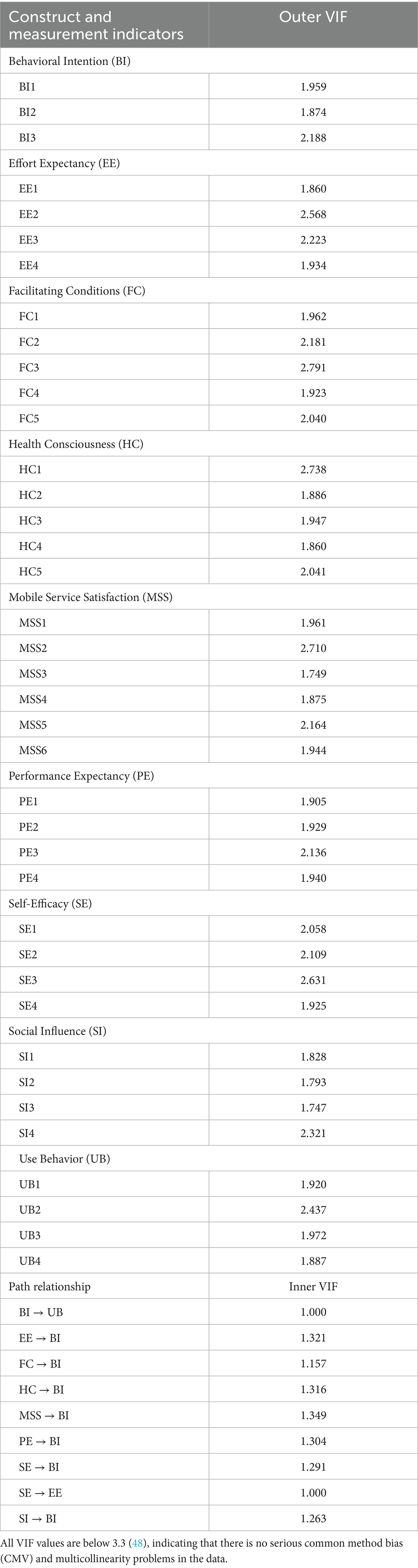 To assess the presence of common method variance (CMV) and multicollinearity in the study data, the Full Collinearity VIF approach proposed by Kock (48) was employed. This method treats all latent variables as dependent variables in a full collinearity test and calculates the variance inflation factor (VIF) values for both the outer measurement model (Outer VIF) and the inner structural paths (Inner VIF). According to Kock (48), VIF values below 3.3 indicate the absence of serious common method bias and acceptable levels of multicollinearity.
