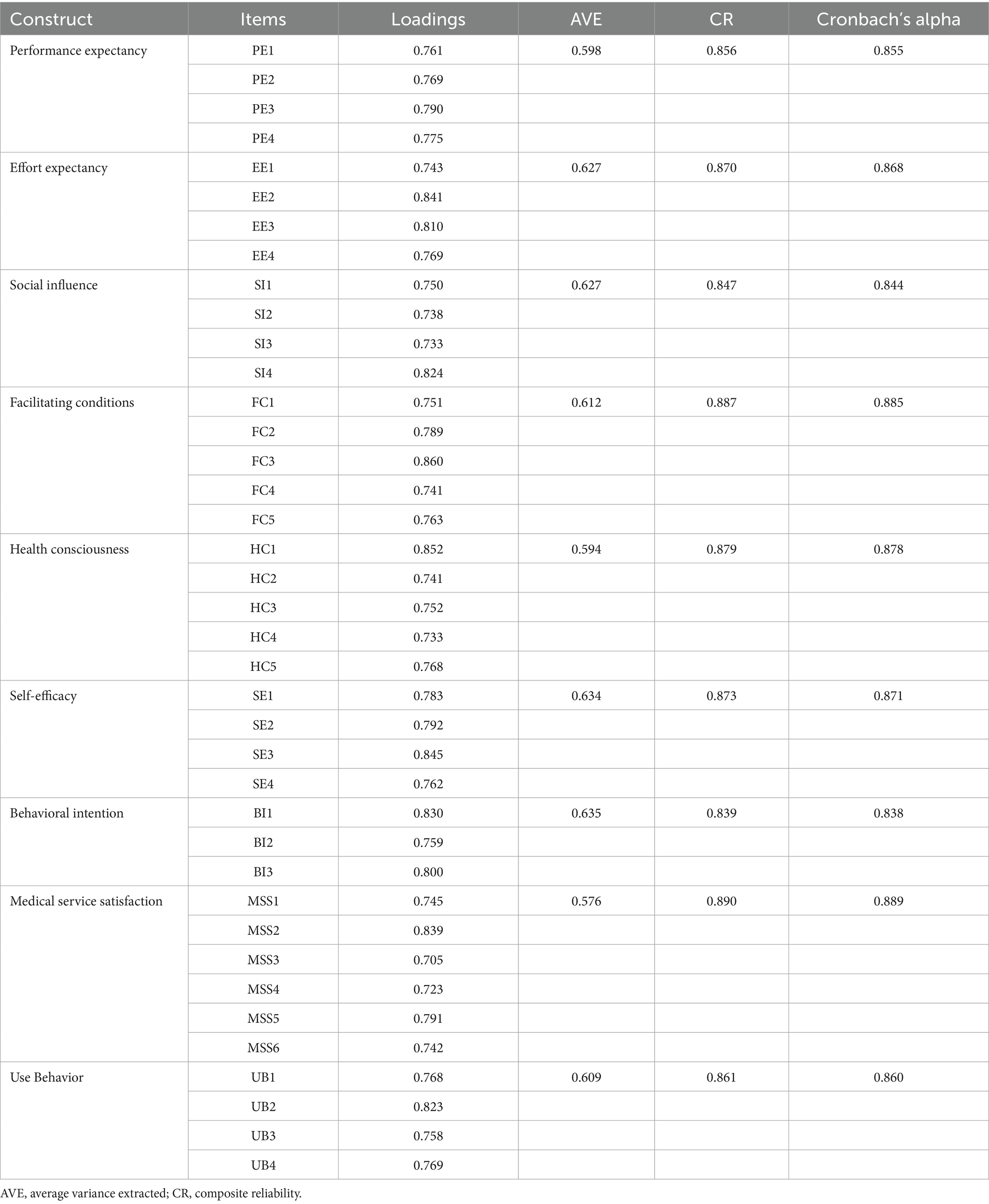The examination of internal reliability utilized Cronbach’s alpha, and it was decided that a value of Cronbach’s alpha over 0.70 for the measurement model was an acceptable sign of internal consistency (51). According to Table 4, the computed Cronbach’s alpha values range between 0.838 and 0.889. This is above the acceptable threshold, indicating that the prerequisites for internal reliability have been met.
