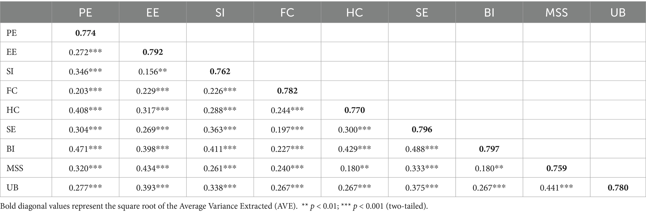 Firstly, PLS is particularly beneficial in the early stages of theoretical model development, especially when the measurement model and its constructs are not yet fully established (47). Secondly, PLS allows for the measurement of both reliability and validity in structural models, providing insights into the relationships between various factors in the measurement model. This makes PLS particularly suitable for testing complex theoretical models, such as the expanded UTAUT framework.