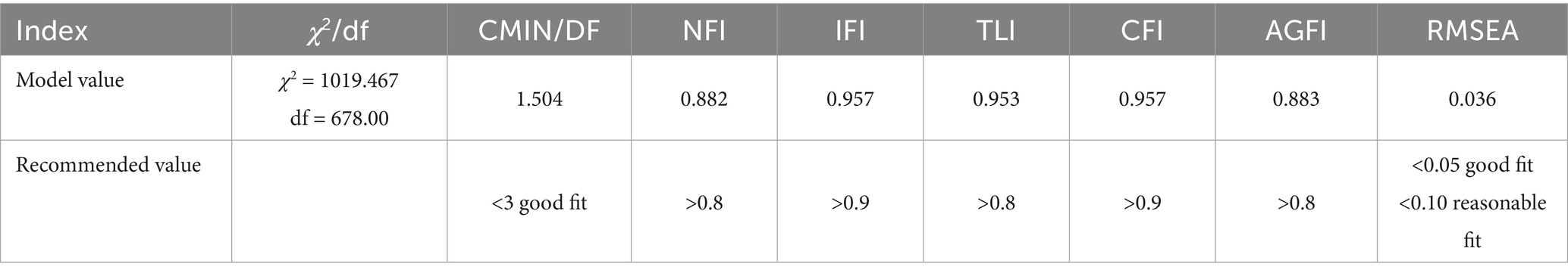 We can see all of the model fit indices and the numerical recommendation criteria for this study in Table 6. A value of 1019.467, 678.00, and 1.504 for the chi-squared degree of freedom were obtained from the total measured model fit index test. It was discovered that a chi-squared/DF value of less than 3.0 fell within the suggested range of values (54). Because it is possible to base it on the comparison of the numerical results provided in Table 6 with the values of the indicated range, it is possible to draw the conclusion that the measurement model is appropriate for further inquiry based on the findings of this investigation. The model has achieved an acceptable degree of fit and is now ready for the next stage of examination.