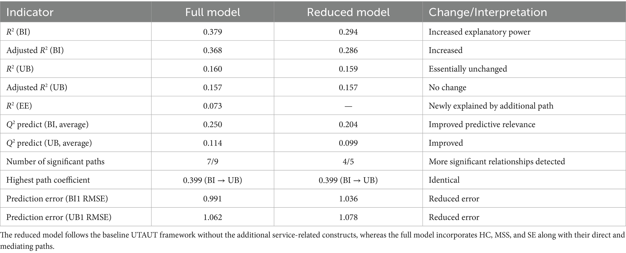 To ensure the robustness of the research findings, the structural model was further subjected to robustness testing by comparing a reduced model with the full structural model. Following the recommendations of Hair et al. (55) and Shmueli et al. (56). The reduced model was derived directly from the original UTAUT framework, retaining only the baseline constructs and hypothesized relationships, Performance Expectancy (PE), Effort Expectancy (EE), Social Influence (SI), and Facilitating Conditions (FC), as predictors of Behavioral Intention (BI) and Use Behavior (UB). It excluded all three extended constructs introduced in this study, namely Health Consciousness (HC), Medical Service Satisfaction (MSS), and Self-Efficacy (SE), along with their respective hypothesized paths (HC → BI, MSS → BI, SE → BI, and SE → EE).