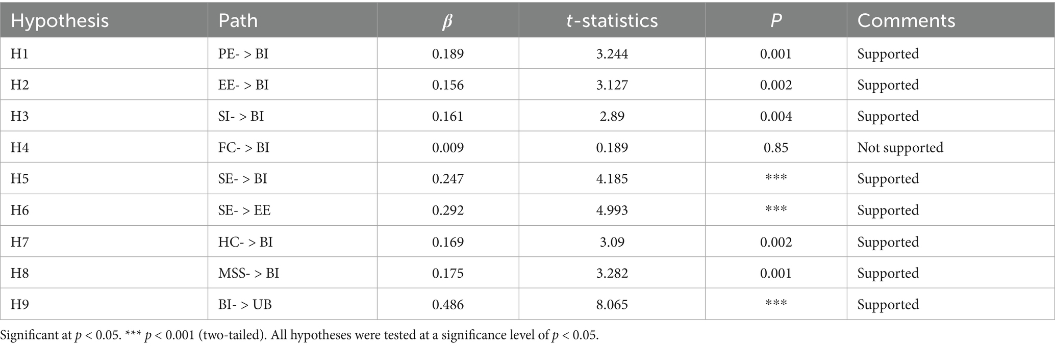 Based on the data, the following hypothesis (H1, H2, H3, H5, H6, H7, H8, and H9) were supported. The pathways PE-BI (t = 3.244, B = 0.189, p < 0.05), EE-BI (t = 3.127, B = 0.156, p < 0.05), SI-BI (t = 2.89, B = 0.161, p < 0.05), SE-BI (t = 4.185, B = 0.247, p < 0.05), SE-EE (t = 4.993, B = 0.292, p < 0.05), HC-BI (t = 3.09, B = 0.169, p < 0.05), MSS-BI (t = 3.282, B = 0.175, p < 0.05), BI-UB (t = 8.065, B = 0.486, p < 0.05).