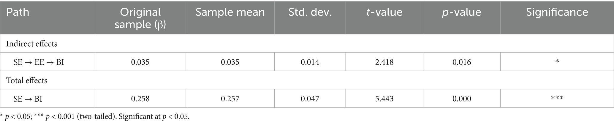 The results of the indirect and total effects are presented in Table 9. Bootstrapping analysis (5,000 resamples) indicates that the indirect effect of self-efficacy (SE) on behavioral intention (BI) through effort expectancy (EE) is significant (β = 0.035, t = 2.418, p < 0.05), suggesting that self-efficacy can influence behavioral intention indirectly via effort expectancy. In addition, the total effect of SE on BI is also significant (β = 0.258, t = 5.443, p < 0.001), indicating that self-efficacy not only exerts a direct impact on behavioral intention but also affects it indirectly through the mediating pathway.
