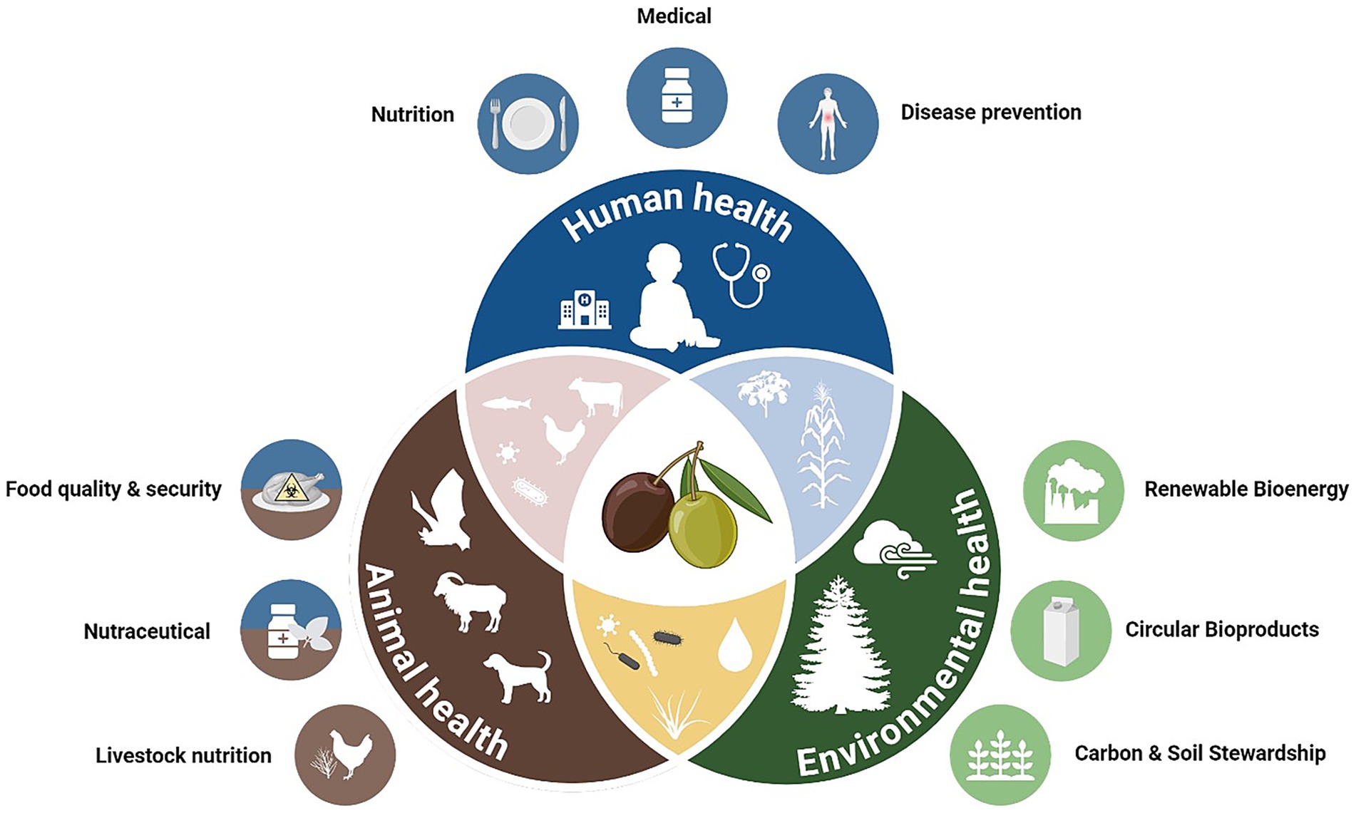 One Health is a multi-sectoral approach which recognizes that human health is connected to animal health and to the environment, emphasizing the need for integrated actions to address global health challenges (1, 2). Olives and olive oil, renowned for their nutritional and medicinal properties, represents a compelling case study within this framework due to its significant impacts across all three domains (3, 4) (Figure 1).