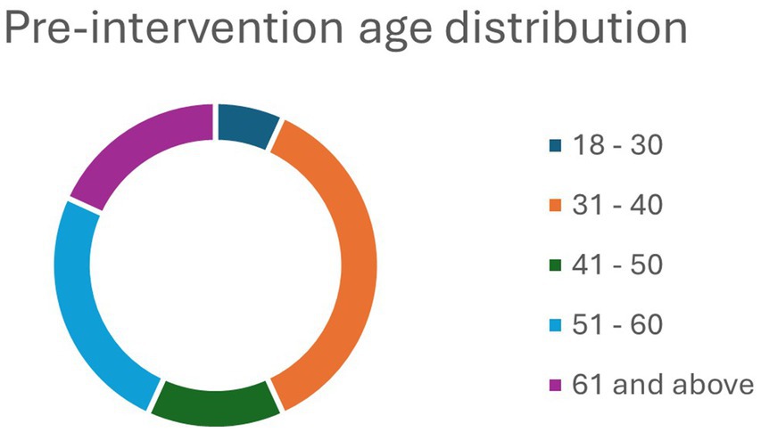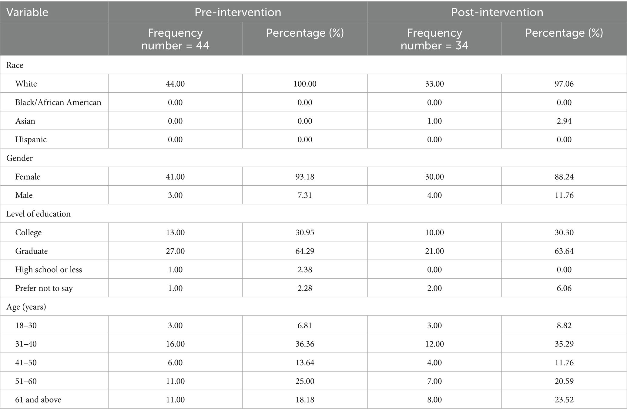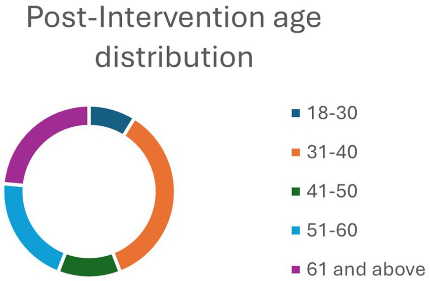 A total of 44 and 34 faculty and staff members responded well to the pre- and post-intervention questionnaire survey, respectively. Most of the participants were females in the pre-intervention (93.18%) and post-intervention (88.24%) groups (Table 1). About two-thirds of the respondents in both groups – pre-intervention group (64.29%) and post-intervention (63.64%)- had a graduate degree. Similarly, more than a third of both pre-intervention (36.36%) and post-intervention (35.29%) groups were within the age group 31–40 years (Table 1). Pre- and post-intervention age breakdowns can be found in Figures 1, 2. Importantly, the age breakdown between groups is to be expected since the program dropouts would alter some of the final demographic information. The predominant race in both groups was white, limiting the ability to generalize these findings to more diverse colleges and universities.