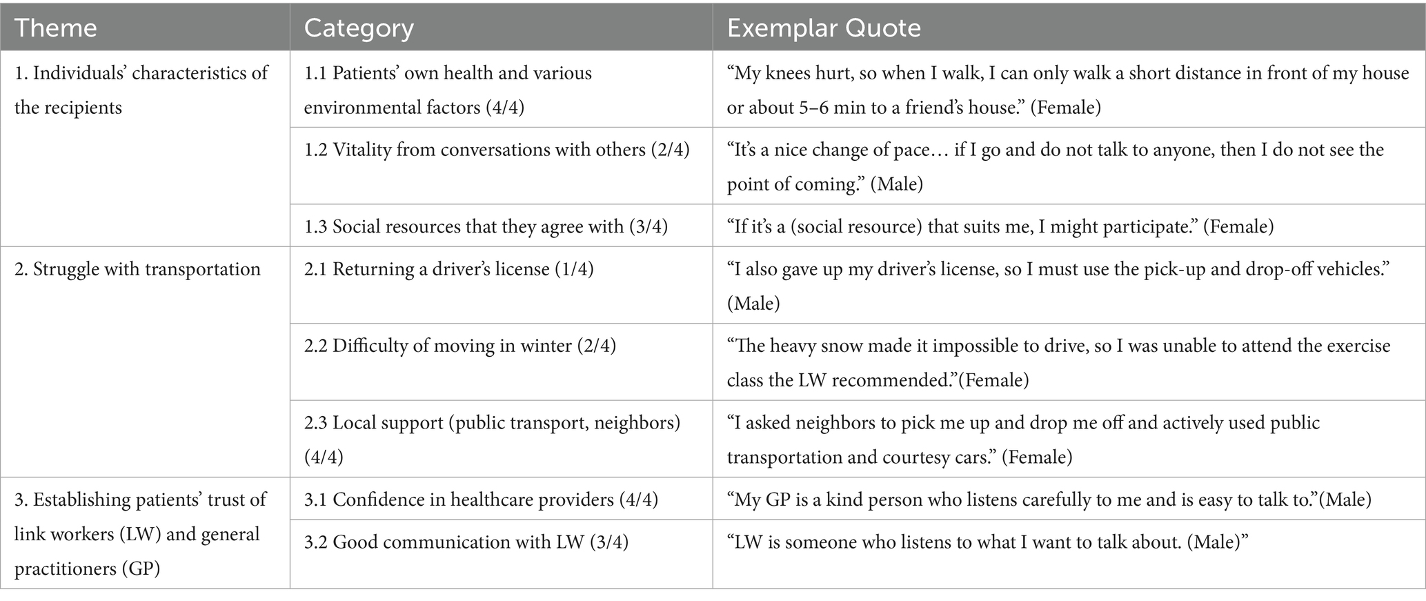 Table 2. General practitioners and link workers’ perspectives: themes, categories, exemplar quotes, and frequency (n/17).