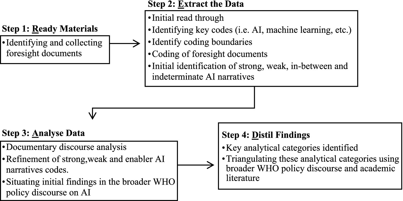 The point of departure was to draw on the analytical framework of strong and weak AI narratives (8), to explore WHO’s discourses on AI within and beyond their foresight exercises. The data was analysed using a multi-stage process call the READ Approach, developed by Dalglish et al. (36) specifically for documentary analysis of health policy. The four steps of this approach (Readying Material, Extract the Data, Analyse Data, and Distil Findings), are used to structure this methodology section (see Figure 1. for a workflow).
