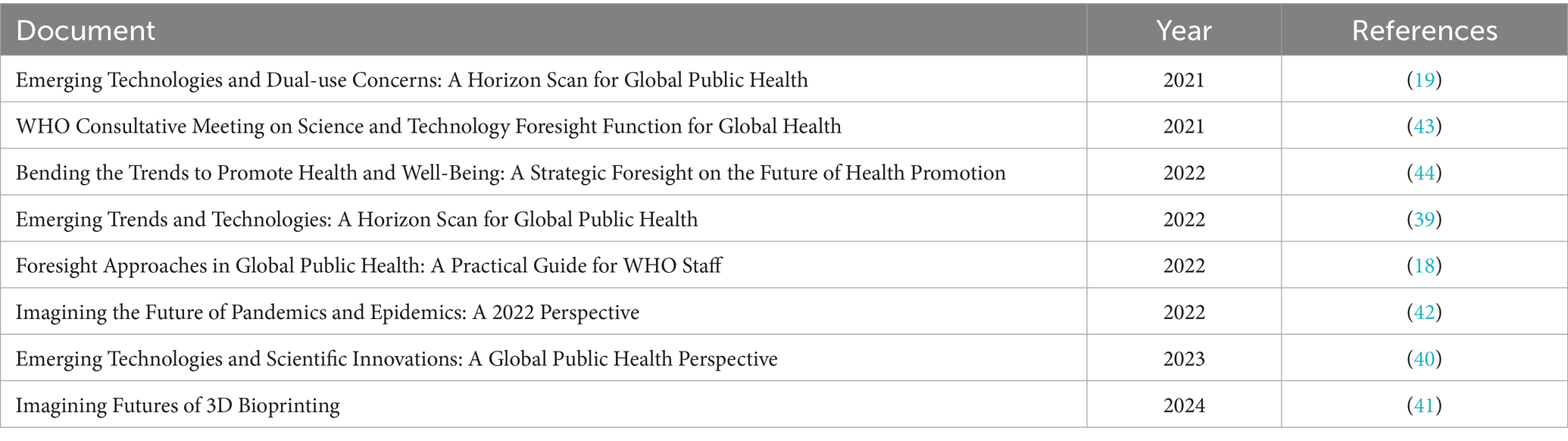 One means by which WHO have tried to meet this challenge is through a series of foresight exercises. Foresight provides a framework for the exploration of future scenarios, and thus strategic areas for research and development, in a systematic manner (39). As WHO note: “The aim of the WHO global health foresight function is to inform decisions about innovation, development and emerging science and technology, shape development, diffusion and adoption of health innovations and proactively identify emerging problems and challenges” (World Health Organization, 2023, p. 19).