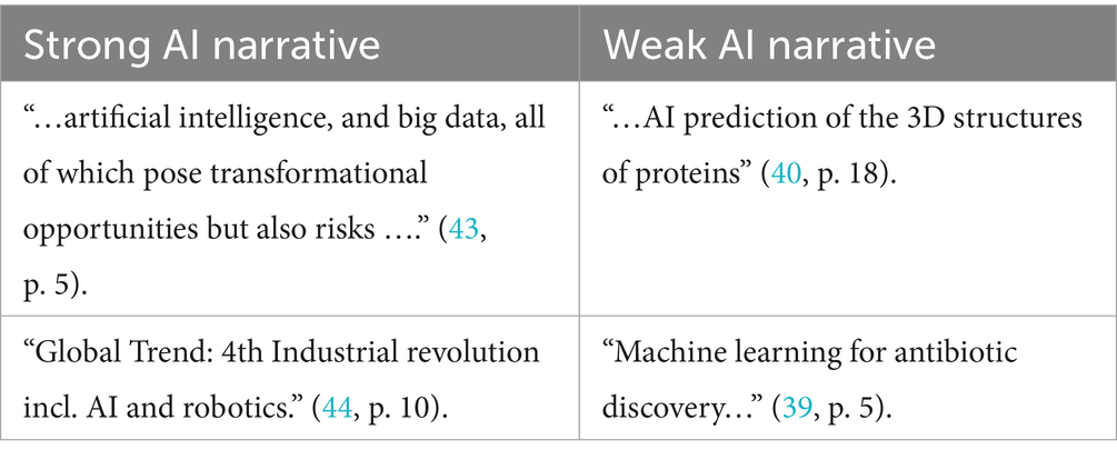 The analysis presented here draws on the concept of “strong” and “weak” AI narratives set out by Bory et al. (8). This analytical framework was proposed to draw more attention to, and develop sensitivity around, the critical role of the interconnected narratives that shape AI futures. It is argued that such an approach is needed given that “When looking at policy debates and policy documents on AI, there is a remarkable ambivalence between the prevalence of strong and weak AI narratives” (8, p. 7). This approach builds on work on AI imaginaries (for example 28, 29) and proposes a framework to complement existing categorisation of technological imaginaries while addressing the need for more critical interrogation of strong and weak AI narratives.