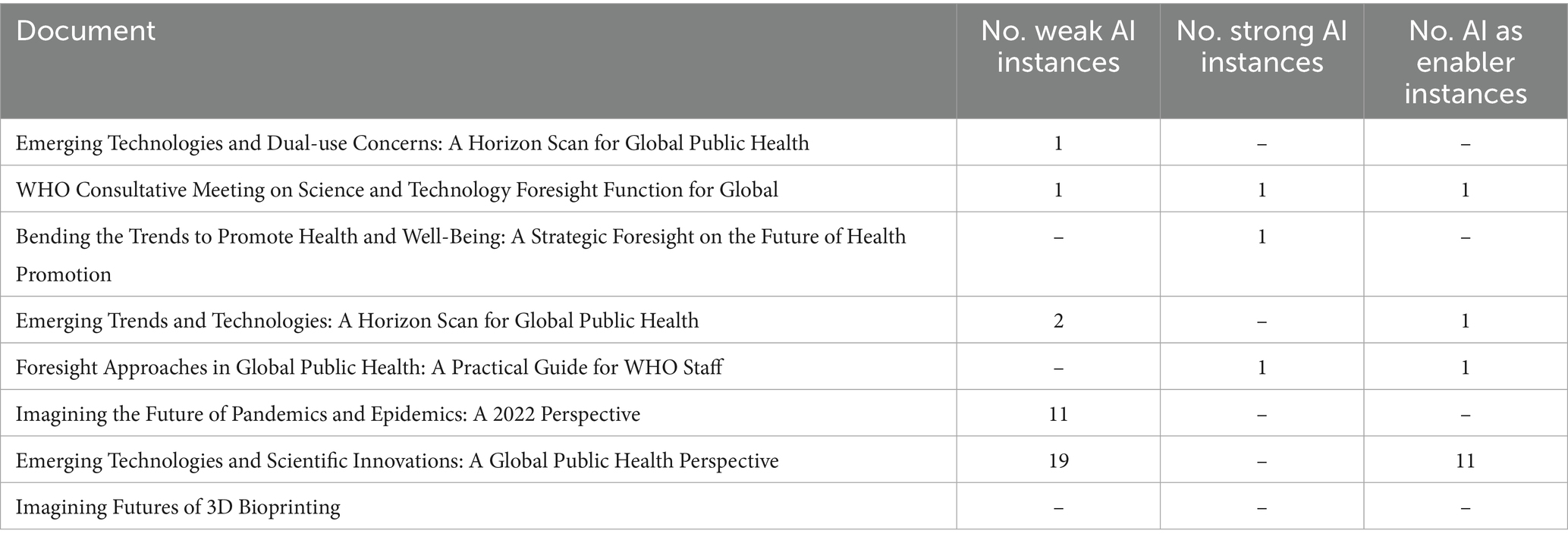 Regarding the instances of weak AI narratives, these were present in five out of eight of the documents (19, 39–41, 43) with the most being found in the foresight exercises with a broader focus, i.e., those on emerging technologies (see Table 3). Weak AI narrative instances were concentrated in two documents, with 19 instances in Scientific Innovations: A Global Public Health Perspective (40) and 11 in Imagining the Future of Pandemics and Epidemics: A 2022 Perspective (42). Two instances of weak AI narratives were found in Emerging Trends and Technologies: A Horizon Scan for Global Public Health (18), and one in both Emerging Trends and Technologies: A Horizon Scan for Global Public Health. These weak narratives pointed to AI being most potentially impactful in (1) diagnostics (including precision medicine), (2) drug discovery, (3) clinical reasoning support (4) health system management (including public health), (5) digital twins, (6) disease outbreak management and (7) artificial organs. These all varied considerably in terms of likelihood of being realised and potential impact, though the time frame was 5–10 years for the vast majority (other timeframes being 0–5 and 10 + years). Instances on strong AI narratives only occurred three times, once in each of the follwing, WHO Consultative Meeting on Science and Technology Foresight Function for Global Health (43), Bending the Trends to Promote Health and Well-Being: A Strategic Foresight on the Future of Health Promotion (44) and Foresight Approaches in Global Public Health: A Practical Guide for WHO Staff (18).