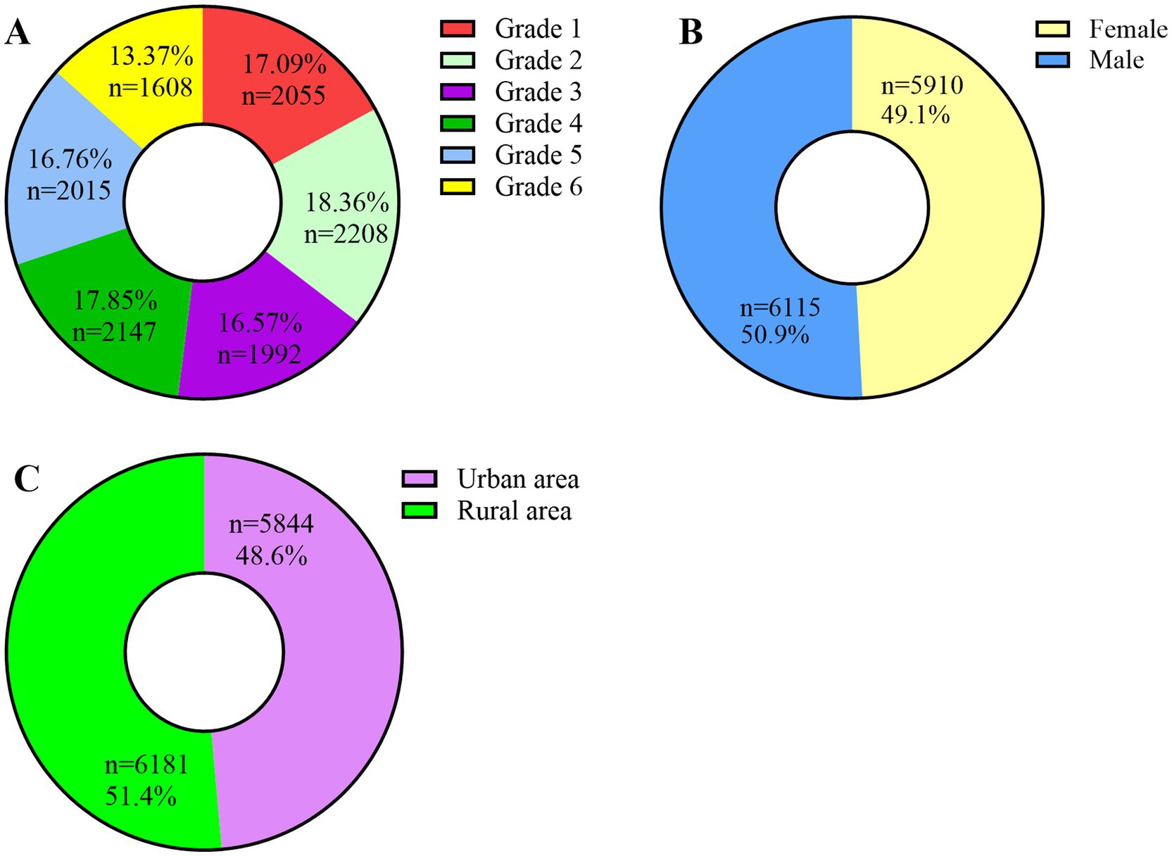 1. The study cohort consisted of 12,025 primary school students, including 6,115 males (50.9%) and 5,910 females (49.1%), who were recruited from 11 educational institutions in Xingtai City, Hebei Province. Baseline demographic characteristics, with respect to academic progression, were as follows: Grade 1 (n = 2,055; 17.1%), Grade 2 (n = 2,208; 18.4%), Grade 3 (n = 1,992; 16.6%), Grade 4 (n = 2,147; 17.9%), Grade 5 (n = 2,015; 16.8%), and Grade 6 (n = 1,608; 13.4%). With regard to geographic distribution, 5,844 students (48.6%) were from urban areas and 6,181 students (51.4%) were from rural areas (Figure 1).