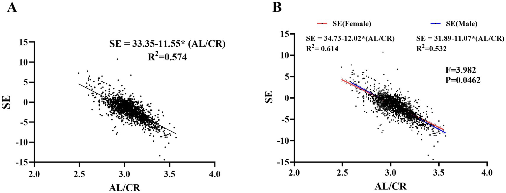 Figure 3. (A) Linear regression analysis of SE on AL/CR across the entire study population. (B) Gender-specific linear regression analysis of SE on AL/CR in the study cohort.