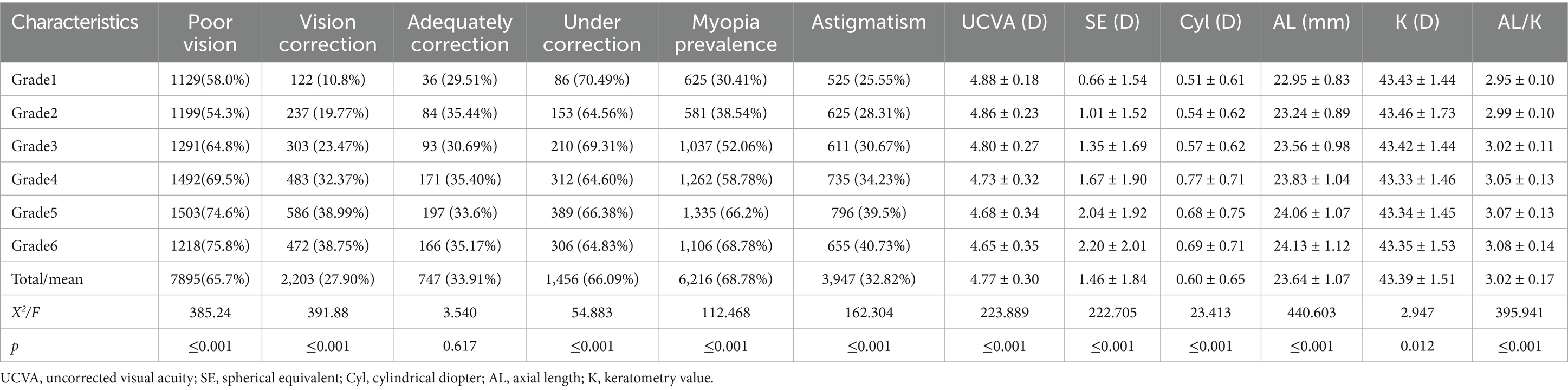 Results: Visual impairment prevalence was 65.65% (7,895/12,025), rising significantly from 58.00% (Grade 1) to 75.75% (Grade 6). Myopia prevalence increased from 30.41% to 68.78% (overall 51.69%). SE shifted myopically (−1.46 ± 1.84D overall; Grade 1: −0.66 ± 1.54D vs. Grade 6: −2.20 ± 2.01D). AL increased with grade (23.64 ± 1.07 mm overall; 22.95 ± 0.83 mm to 24.13 ± 1.12 mm), while corneal curvature remained stable (43.39 ± 1.51D; inter-grade variation <0.13D). The AL/corneal radius ratio correlated linearly with SE (3.02 ± 0.17 overall; 2.95 ± 0.10 to 3.08 ± 0.14).