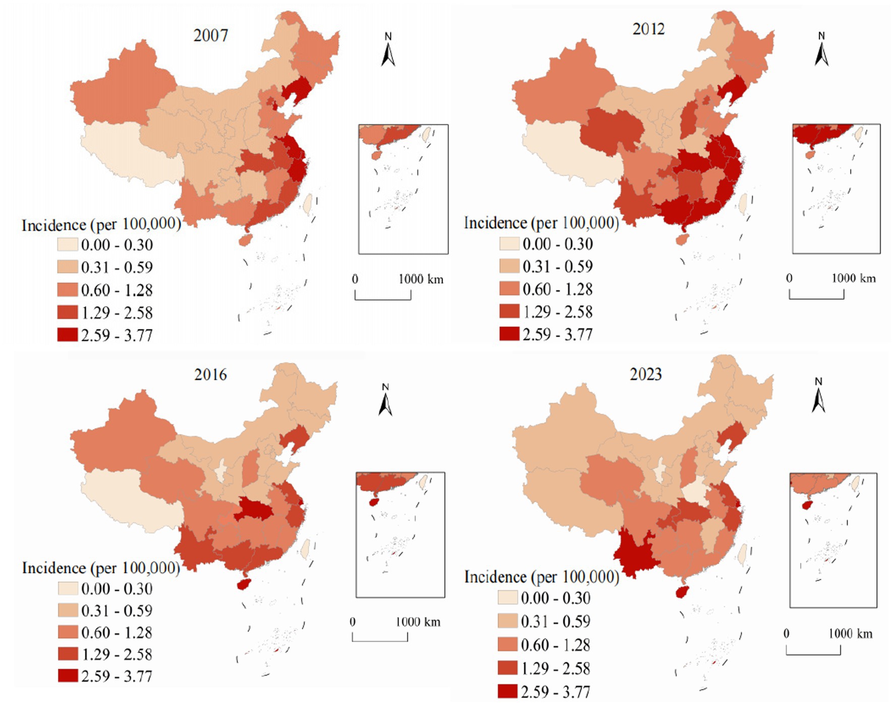 Annual incidence were calculated using the formula: annual incidence = (Number of new cases per year/Mid-year population) × 100,000. Denominator population data were obtained from annual census and sample survey data published by the National Bureau of Statistics, using mid-year population (July 1) as the exposure population base. For provincial annual incidence, resident population data for corresponding provinces and years were used. Annual incidence are expressed population and rounded to two decimal places. Age-specific annual incidence used corresponding age group populations as denominators, and sex-specific rates were calculated using respective sex populations.