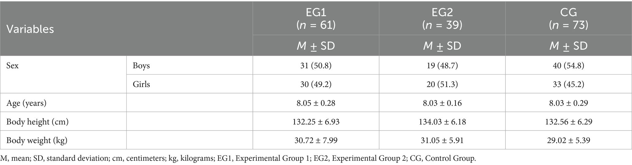 The study recruited 173 healthy children (83 girls and 90 boys) aged 8 to 9 from the second grade of three public primary schools in Poznan, Poland (urban area). The school’s PE curriculum followed the unified standards established by the Polish National Ministry of Education. The sample size calculation was conducted using G*Power 3.1 software, with an anticipated effect size of 0.25, a significance level (α) of 0.05 and statistical power set at 0.90, which resulted in a minimum sample size of 162. The research was carried out between January and May 2024. Exclusion criteria for participants were: (1) children younger than 8 and older than 9 years; (2) children with congenital diseases; (3) children with intellectual developmental disorders or learning disabilities. The descriptive characteristics of the sample groups are presented in Table 1.