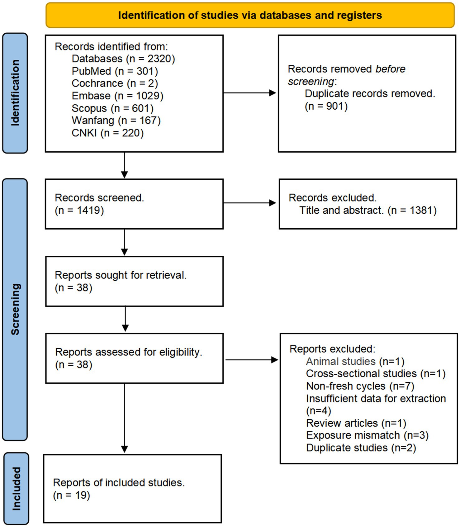 Figure 1 shows the PRISMA flow diagram. Initial searches identified 2,320 records. After deduplication, 1,419 titles/abstracts were screened, yielding 38 full-text articles for eligibility assessment. Nineteen studies were excluded: animal studies (n = 1), cross-sectional studies (n = 1), non-fresh cycles (n = 7), insufficient data for extraction (n = 4), review articles (n = 1), exposure mismatches (n = 3), and duplicate studies (n = 2). A total of 19 studies were included in the quantitative analysis. Of these, 14 were published in English (13–15, 17, 19–29), and 4 were published in Chinese (30–33), spanning publication years from 1994 through 2025. The studies were primarily conducted in the following countries: Brazil, China, Iran, Israel, Italy, the Netherlands, Saudi Arabia, Sweden, Switzerland, Turkey, the United Kingdom, and the United States. The number of fresh embryo transfer cycles per study ranged from 266 to 52,788, with enrollment periods occurring between 1987 and 2023. Descriptive characteristics of the included studies are summarized in Table 1.