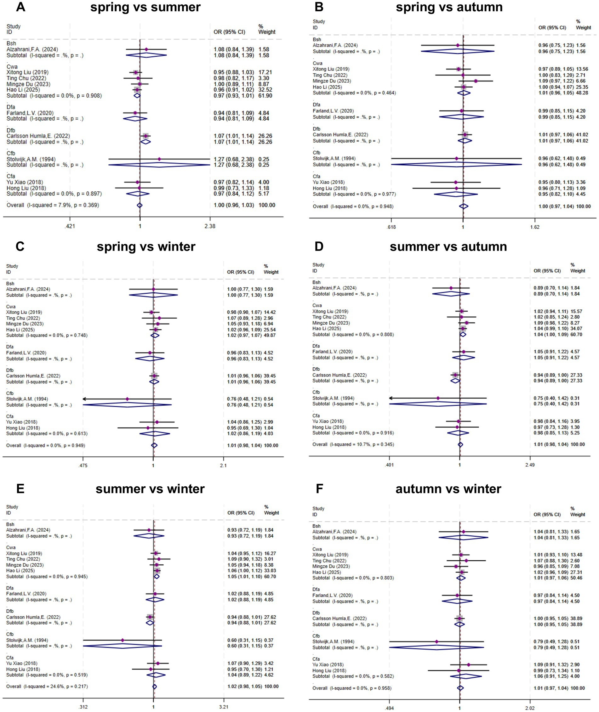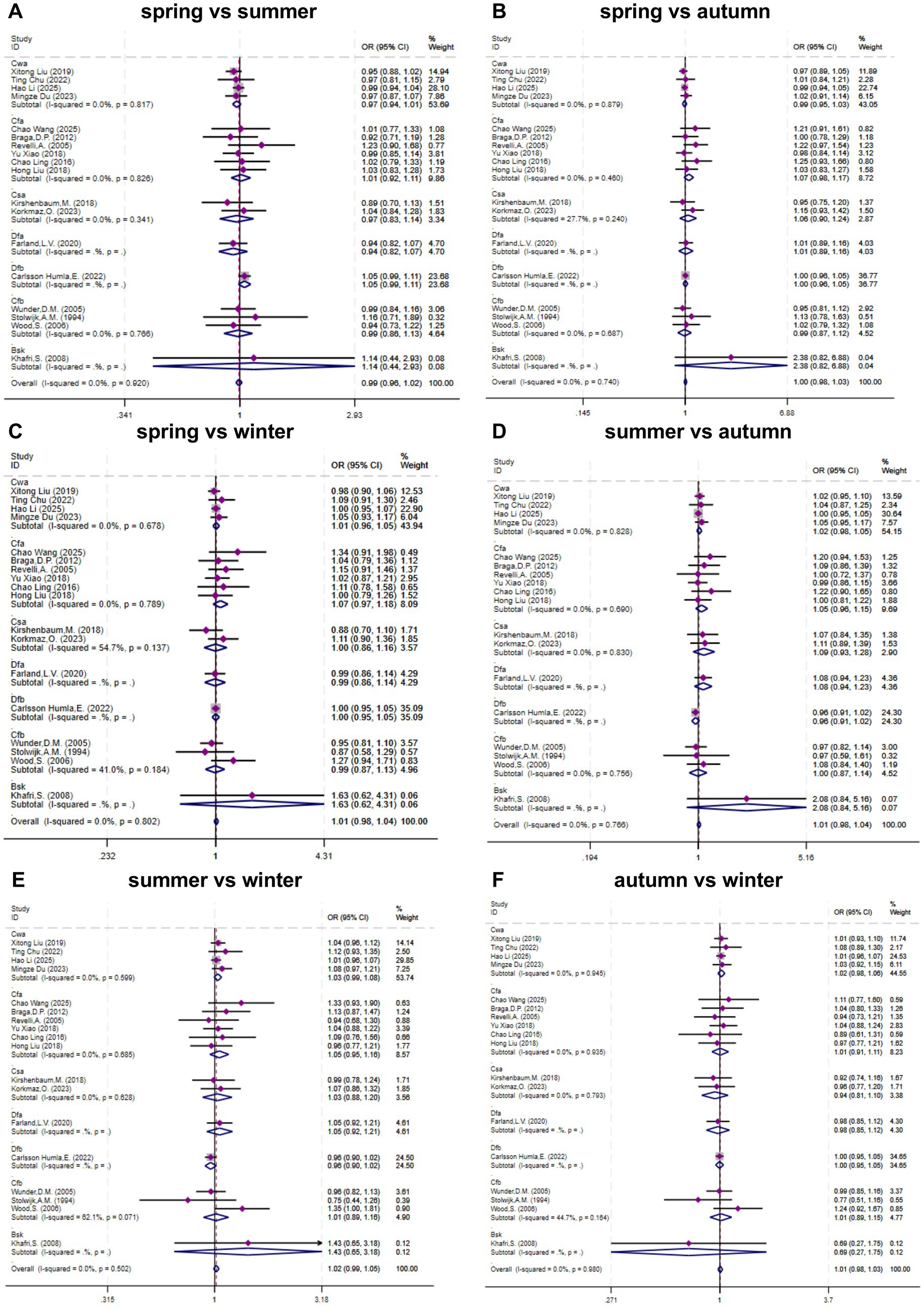 The primary climate type of each study center was classified according to the Köppen climate classification system (see Supplementary Table 3). Using climate type as a subgroup factor, we performed pooled effect size calculations and comparisons across the following six seasonal pairings: (1) Spring vs. Summer; (2) Spring vs. Autumn; (3) Spring vs. Winter; (4) Summer vs. Autumn; (5) Summer vs. Winter; and (6) Autumn vs. Winter. Heterogeneity was assessed using the Cochrane chi-square test and quantified with the I2 statistic; I2 values exceeding 50% indicated substantial heterogeneity. Both fixed-effects and random-effects models were employed for data synthesis. Associations are reported as odds ratios (ORs) with corresponding 95% confidence intervals (CIs). Statistical significance was defined as a p value < 0.05. Publication bias was evaluated via Egger’s test, where p > 0.05 suggested no significant bias. If significant publication bias is present, the trim and fill method will be employed to assess its impact on the conclusions. Sensitivity analyses utilized the leave-one-out method. All analyses were conducted via STATA software, version 18.0.