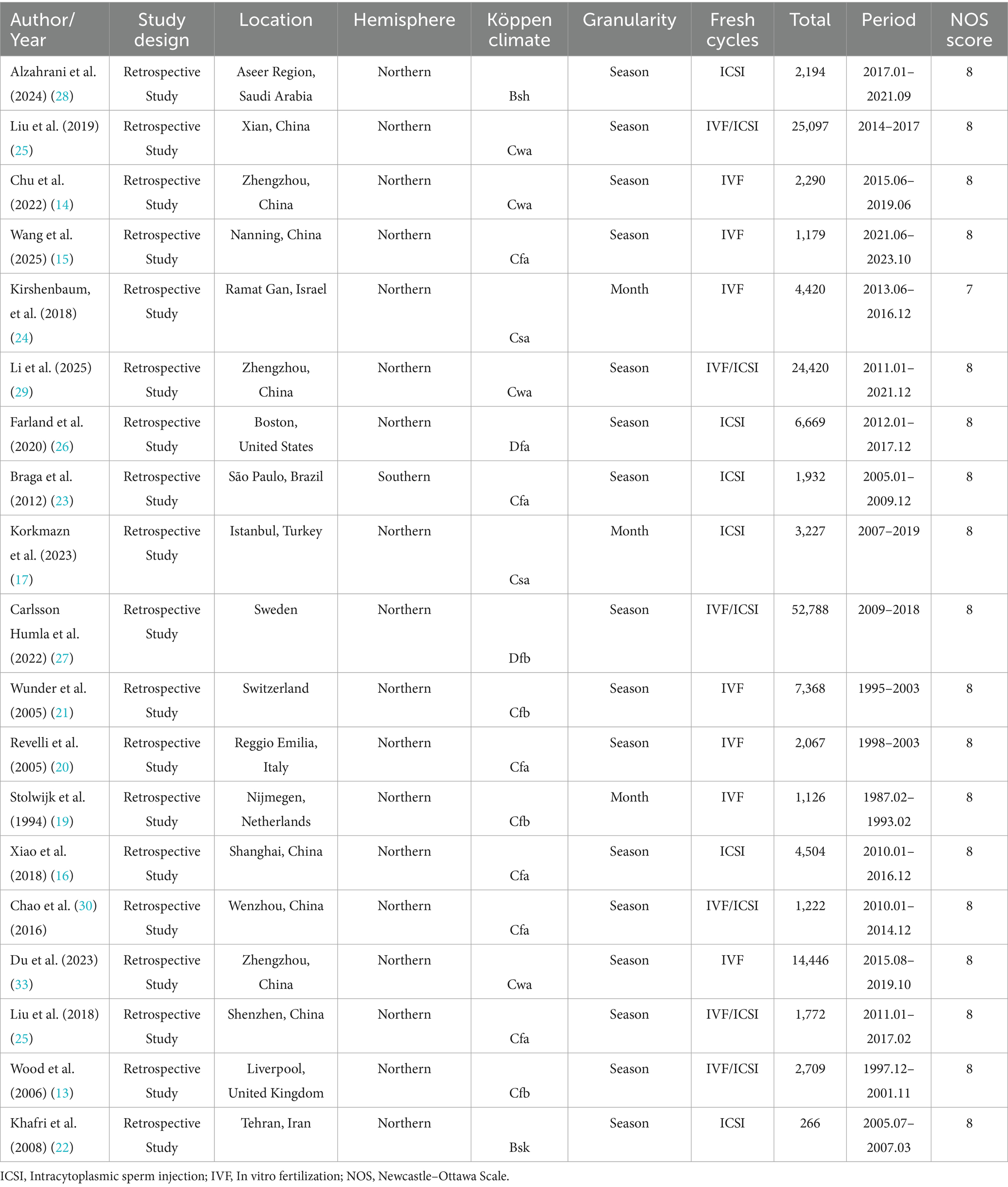Two investigators (Q D and FY W) independently screened the studies. The inclusion criteria were defined according to the PECOS framework (population, exposure, comparison, outcome, study): (1) population: women undergoing fresh embryo transfer cycles, including in vitro fertilization (IVF) and intracytoplasmic sperm injection (ICSI); (2) exposure: spring, summer, autumn, or winter; (3) comparison: comparisons between different seasons (e.g., spring vs. summer, summer vs. autumn); (4) outcome: clinical pregnancy and live birth; (5) study: cohort studies and case–control studies. The exclusion criteria were as follows: (1) studies lacking appropriate comparison groups (e.g., due to non-standardized seasonal definitions); (2) duplicate publications (only the study with the longest follow-up or most complete data was included); (3) studies where full-text articles or essential data were inaccessible; and (4) conference abstracts.