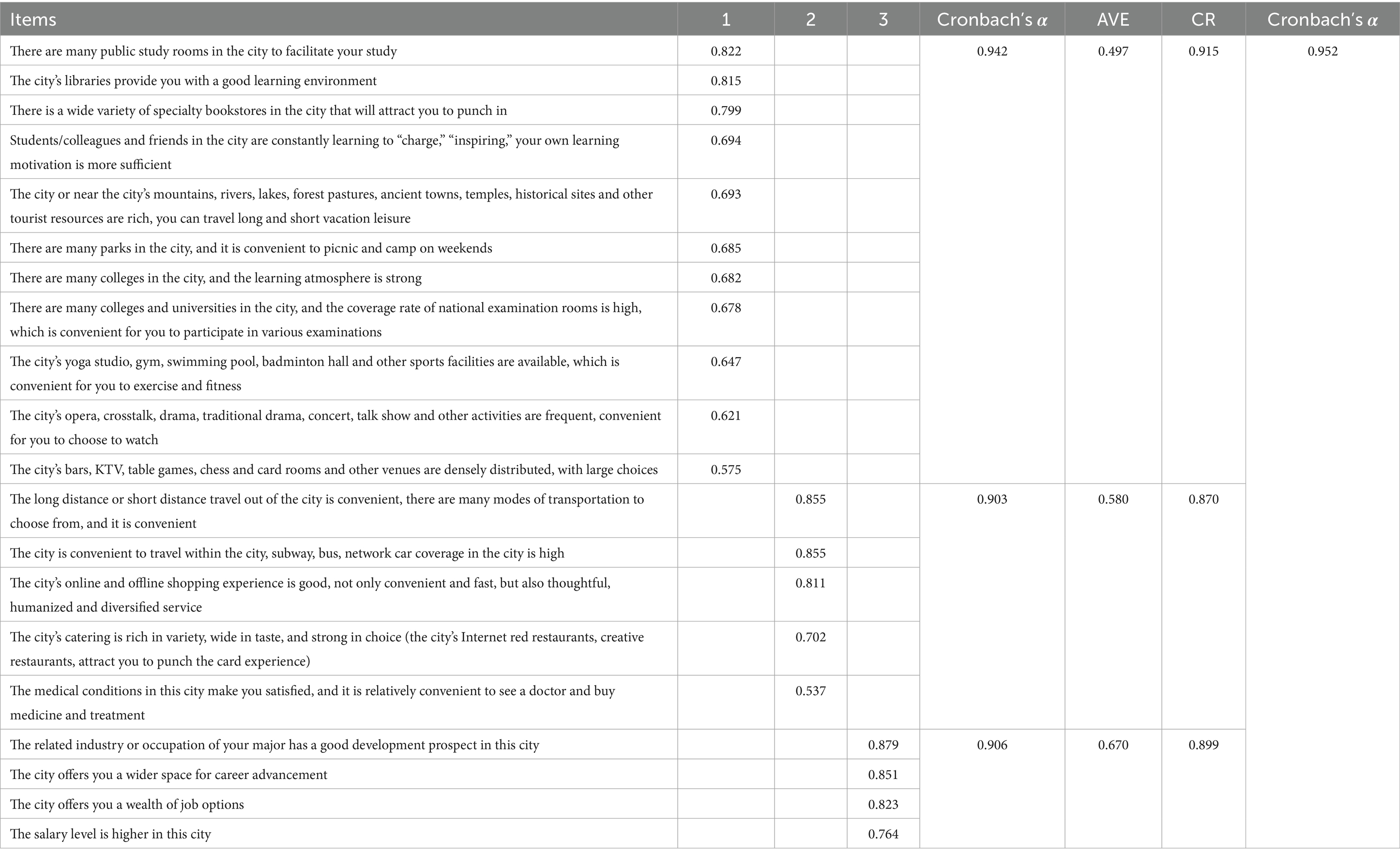 First, the reliability of each item is assessed by the corrected item–total correlation (CITC) coefficient; the items with a CITC coefficient less than 0.5 are eliminated. Accordingly, the item “The cost of living in this city is within your acceptable range” is excluded. The Cronbach’s α value of the initial scale for the remaining 22 items is 0.953, indicating that the scale has good reliability. Second, Kaiser–Meyer–Olkin (KMO) and Bartlett’s sphericity tests were performed on 22 items, and the results showed that the KMO value was 0.949, and the Bartlett’s sphericity test reached a significance level of 0.001, indicating that the original data were suitable for factor analysis. Third, principal component analysis and the varimax rotation method are used for factor analysis. Factors are extracted according to the standard with an eigenvalue greater than 1, and items with a factor load value less than 0.5 are gradually removed from small to large, such as “The city’s compulsory education resources are good, the school enrollment of (future) children is convenient. The city’s climate, environment and other conditions are comfortable for you living here (less extreme weather, good air quality, and high urban greening rate).” are deleted. There are 20 items remaining on the scale. Three common factors are extracted. Exploratory factor analysis was conducted again for the remaining items. The KMO value of the sample data was 0.947, and the Bartlett’s sphericity test results were significant (p < 0.001). Three common factors were still extracted; the cumulative variance contribution rate reached 70.422%, and the factor load of each item was greater than 0.5. It can be seen from Table 1 that the Cronbach’s α coefficient of the scale as a whole is 0.952, and the Cronbach’s α coefficient of each factor is greater than 0.9, indicating that the scale has good reliability.