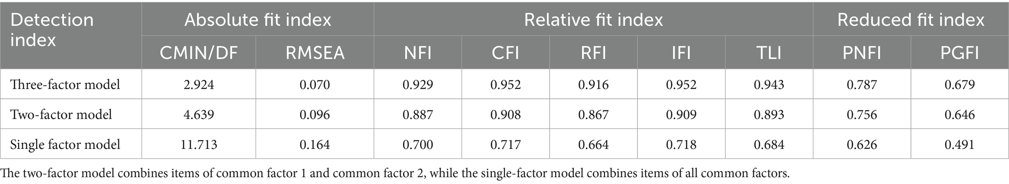 With three common factors as latent variables, a confirmatory factor analysis test model was constructed. AMOS 26.0 structural equation software was used to analyze the structure of the three factors. Compared with the two-factor model and the single-factor model, the three-factor model had better goodness of fit (see Table 3). The absolute fitting index of the model showed: χ2/df = 2.924 (less than 3), Root Mean Square Error of Approximation (RMSEA) = 0.07 (less than 0.08). Relative fitting index (greater than 0.9) showed Comparative Fit Index (CFI) = 0.952, Normed Fit Index (NFI) = 0.929, Relative Fit Index (RFI) = 0.916, Incremental Fit Index (IFI) = 0.952, and Tucker–Lewis index (TLI) = 0.943. A reduced fitting index (greater than 0.5) yielded Parsimonious Normed Fit Index (PNFI) = 0.787, Parsimonious Goodness-of-Fit Index (PGFI) = 0.679. This indicates that the urban amenity scale is a three-dimensional global construct, and the relationship between the three factors and 20 measurement items exists and is stable.