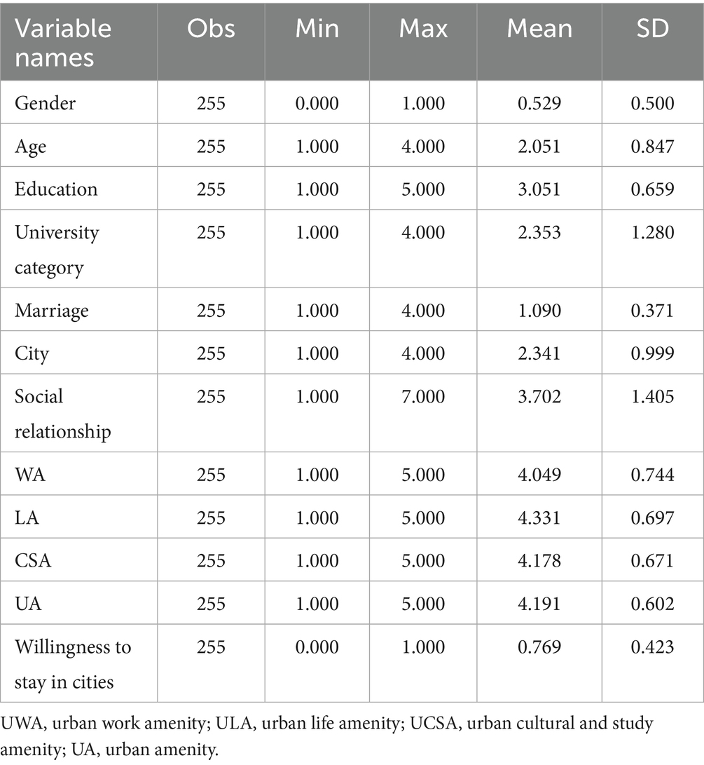 The data used in this study are based on a random sample survey. In March 2023, an online questionnaire survey was conducted among youth from the local colleges in the four first-tier cities of China: Beijing, Shanghai, Guangzhou, and Shenzhen. The term “first-tier cities” is a common classification in China referring to the most economically and culturally advanced metropolises, and the classification is widely used in Chinese academia, media, and official reports (the classification is based on indicators like gross domestic product (GDP), population size, and so on). In the process of collecting questionnaires, we emphasized to the interviewees that the academic research questionnaires require filling in anonymously, and the results of the questionnaire would also be kept confidential. The questionnaires can only be filled in and submitted once, and they cannot be modified after submission. The selection of cities in the survey is mainly based on the following considerations: First, the above four cities are the most typical first-tier cities in China, and their economic, social, and cultural development is relatively better than that of the other cities. Discussion on their urban convenience will be more representative. Second, the above four cities are also gathering places for Chinese universities, and more youth study in these four cities. Examining the willingness of college youth in these four cities to stay in cities is also of great significance for predicting future urban development. The survey’s contents include individual characteristics, social interactions, subjective evaluations of urban convenience, and willingness to stay in the city. After removing missing value samples and invalid questionnaires, 255 valid samples were finally collected (descriptive statistics are presented in Table 4). Among them, 194 college youth expressed their willingness to stay in the city, accounting for approximately 76% of the total sample, which indicates that the college youth group has a strong willingness to stay in first-tier cities.