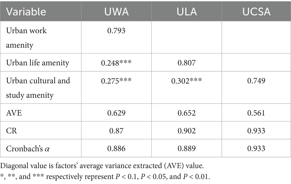 In view of the fact that urban amenity is measured on a 5-point Likert scale, it is still necessary to test the reliability and validity of the data. First, Statistical Package for Social Sciences (SPSS) version 22.0 was used to conduct an exploratory factor analysis on the urban amenity data, and the KMO value was 0.925 (higher than 0.7). Bartlett’s sphericity test found p < 0.001, indicating that it is suitable for factor analysis. Second, the reliability test was conducted. The results showed that the Cronbach’s α coefficient values for urban work amenity, urban life amenity, and urban cultural and study amenity were 0.886, 0.889, and 0.933, respectively (all higher than 0.7, see Table 5). It is shown that the scales of these three variables had passed the test of internal consistency reliability. The Cronbach’s α coefficient for the total scale comprising three variables was 0.946, indicating that the overall structure design of the scale used in this study was highly reliable. Then, AMOS 24.0 was used to conduct confirmatory factor analysis on the recovered data. Each variable was established from a single-factor model to a three-factor model, with fitting and comparison carried out. The results show that the values of CFI, TLI and IFI in the three-factor model are 0.918, 0.905, and 0.919 (higher than 0.9), respectively, RMSEA is 0.086 (close to 0.08), χ2/df is 2.891 (less than 3), and the fit index of the three-factor model is much better than that of other factor models, which achieved a high standard. This shows that the model fits well. Finally, the validity analysis results show that the AVE value of each variable is higher than 0.5, and the CR value is higher than 0.8, indicating that the scale exhibits good convergent validity. Moreover, the square root of the AVE value of each variable is higher than its correlation coefficient with other variables, indicating that the scale has good discriminant validity.