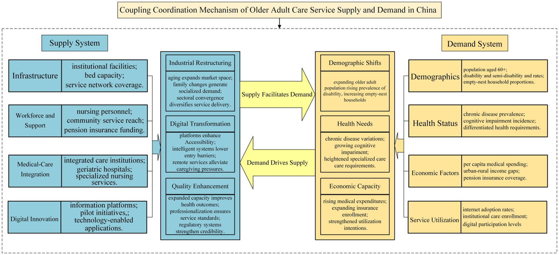 Diagram illustrating the Coupling Coordination Mechanism of Elderly Care Service Supply and Demand in China. The Supply System includes infrastructure, workforce and support, medical-care integration, and digital innovation. The Demand System covers demographics, health status, economic factors, and service utilization. Arrows indicate that supply facilitates demand and demand drives supply, emphasizing the interaction between industrial restructuring, digital transformation, quality enhancement, demographic shifts, health needs, and economic capacity.