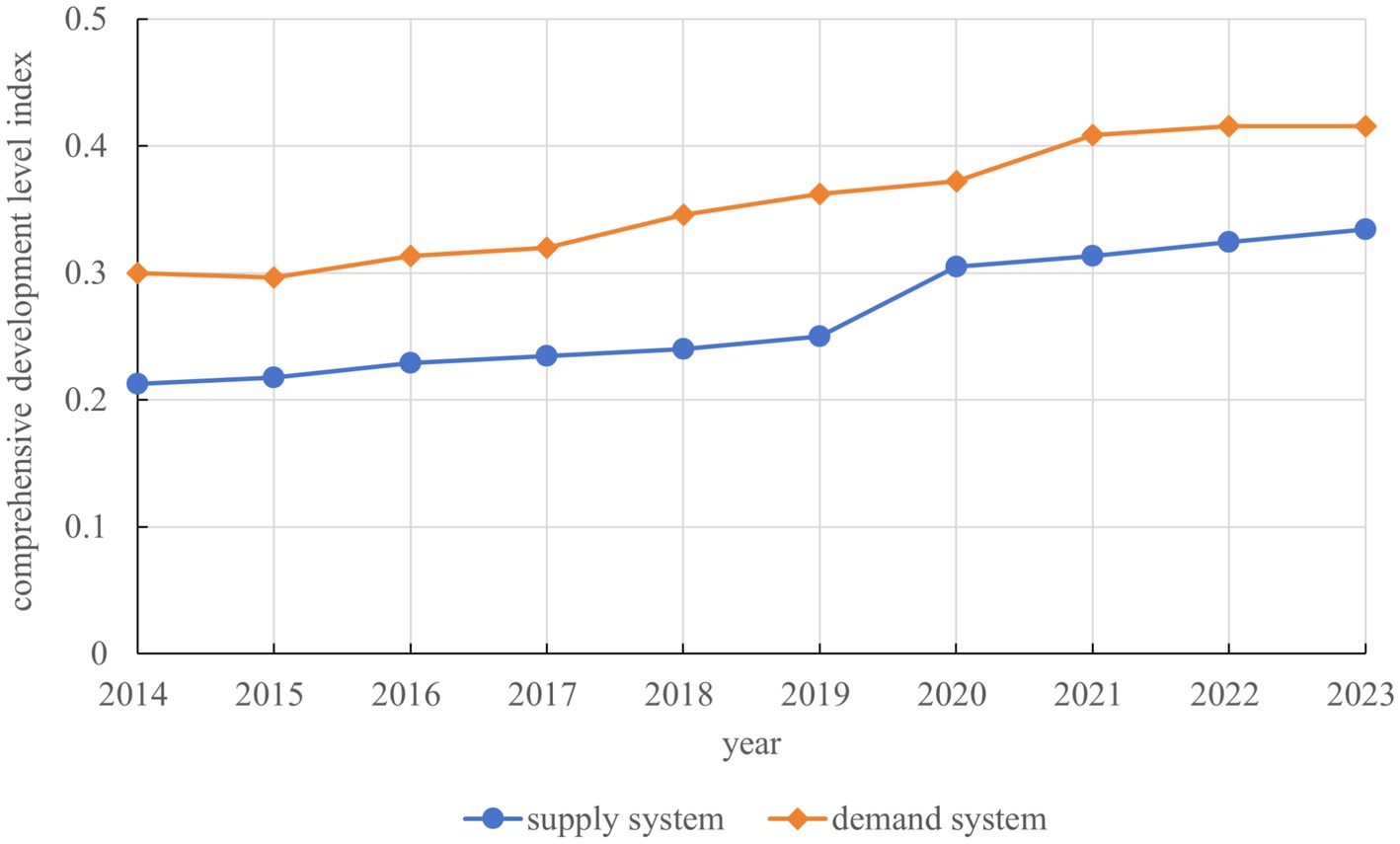 Economic and consumption capacity serve as key factors for transforming older adult care service demand into effective demand (37). Per capita medical consumption expenditure among the older adult population reflects the actual consumption capacity and payment willingness of the older adult population. The urban–rural older adult income disparity coefficient reflects the spatial distribution characteristics of demand. The number of participants in urban basic pension insurance at year-end reflects the supporting role of institutionalized security in demand release.
