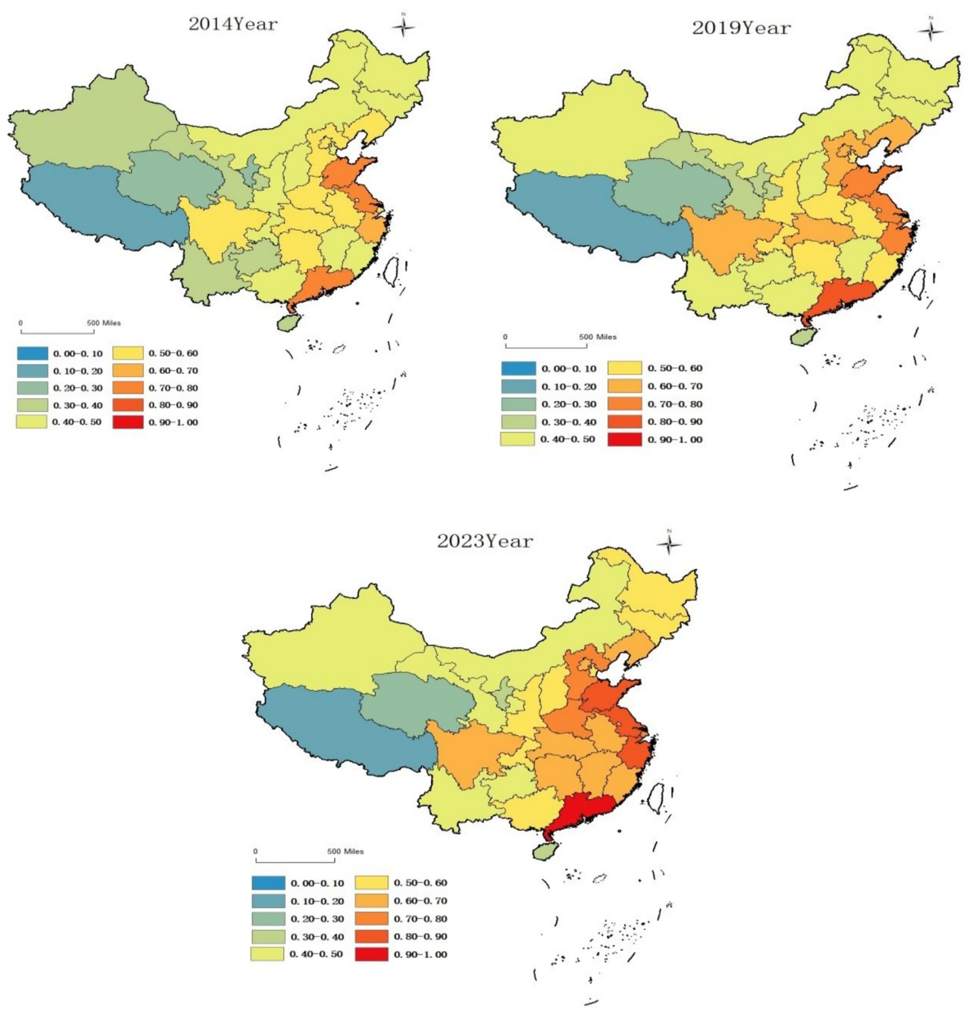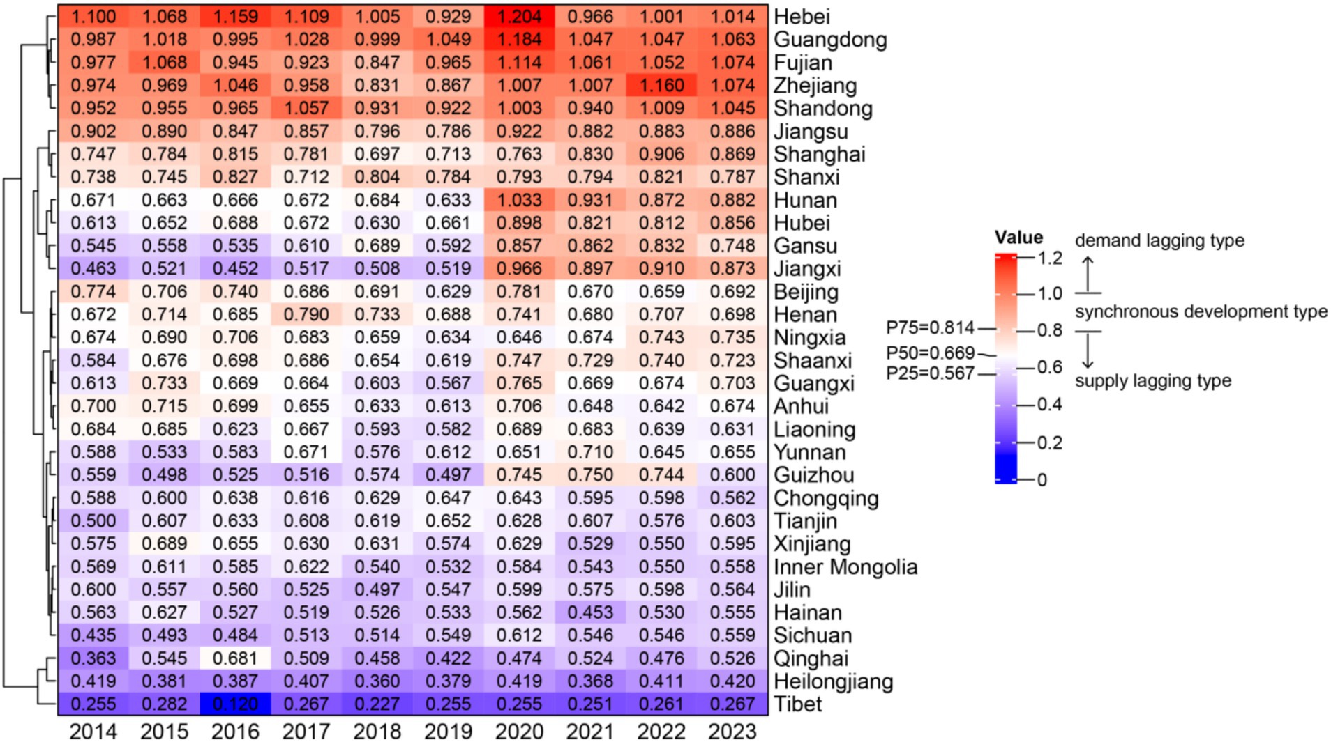 Based on the differential manifestations of relative development degree value intervals, the developmental trends of older adult care service resource supply and demand across provinces and municipalities nationwide are categorized into the following three typical patterns: Specifically, if 0 < r ≤ 0.8, it indicates that older adult care service resource supply is relatively lagging, belonging to the supply-lagging type; when 0.8 < r ≤ 1, it indicates that supply and demand are in a state of synchronized development, belonging to the synchronized development type; whereas when r > 1, it indicates that the demand for older adult care service resources is relatively lagging, belonging to the demand-lagging type. This ratio provides an important reference basis for evaluating the relative development levels of the two subsystems (Equation 8).
