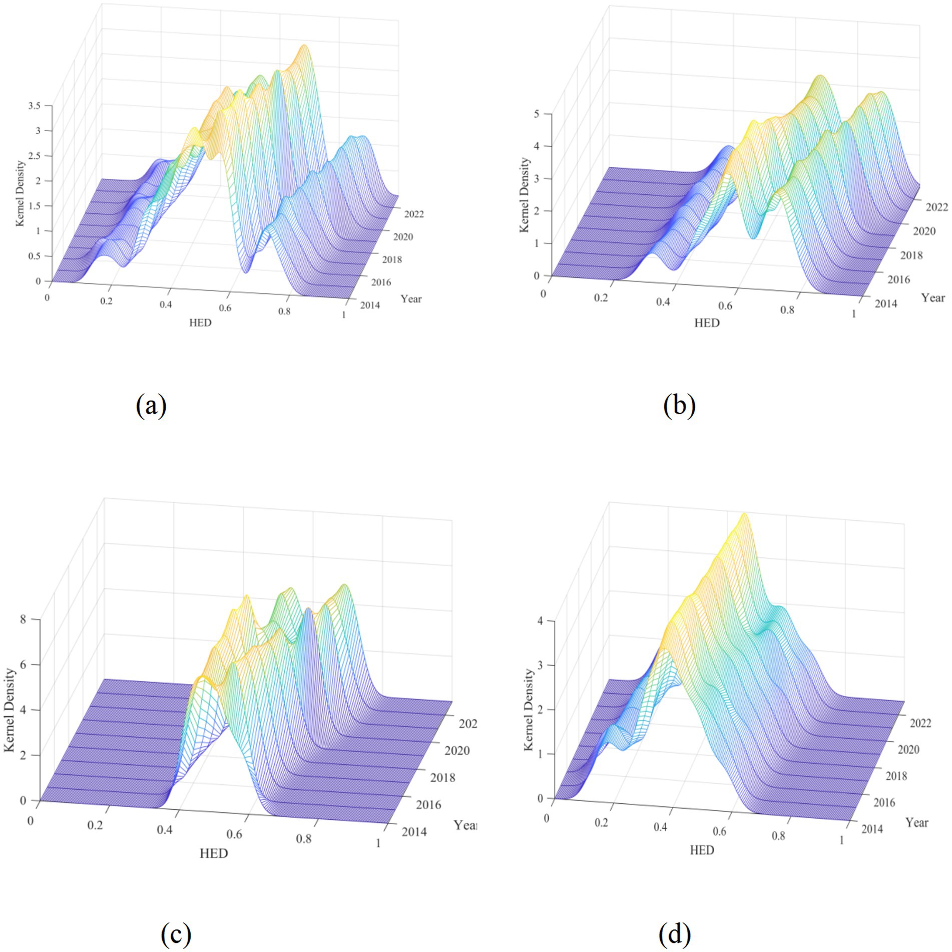 where N is the sample size, h is the bandwidth, and x is the mean. This study employs MATLAB software to generate kernel density plots, with bandwidth settings as follows: national 0.03, eastern 0.04, central 0.03, western 0.03. The distribution position indicates the level of coupling coordination between older adult care service resource supply and demand in a region; the number of peaks indicates the degree of polarization in regional older adult care service resource supply–demand coupling coordination; peak height indicates the magnitude of disparity in regional older adult care service resource supply–demand coupling coordination levels; and distribution extensibility indicates the gap between the highest and lowest level individuals in regional older adult care service resource supply–demand coupling coordination.
