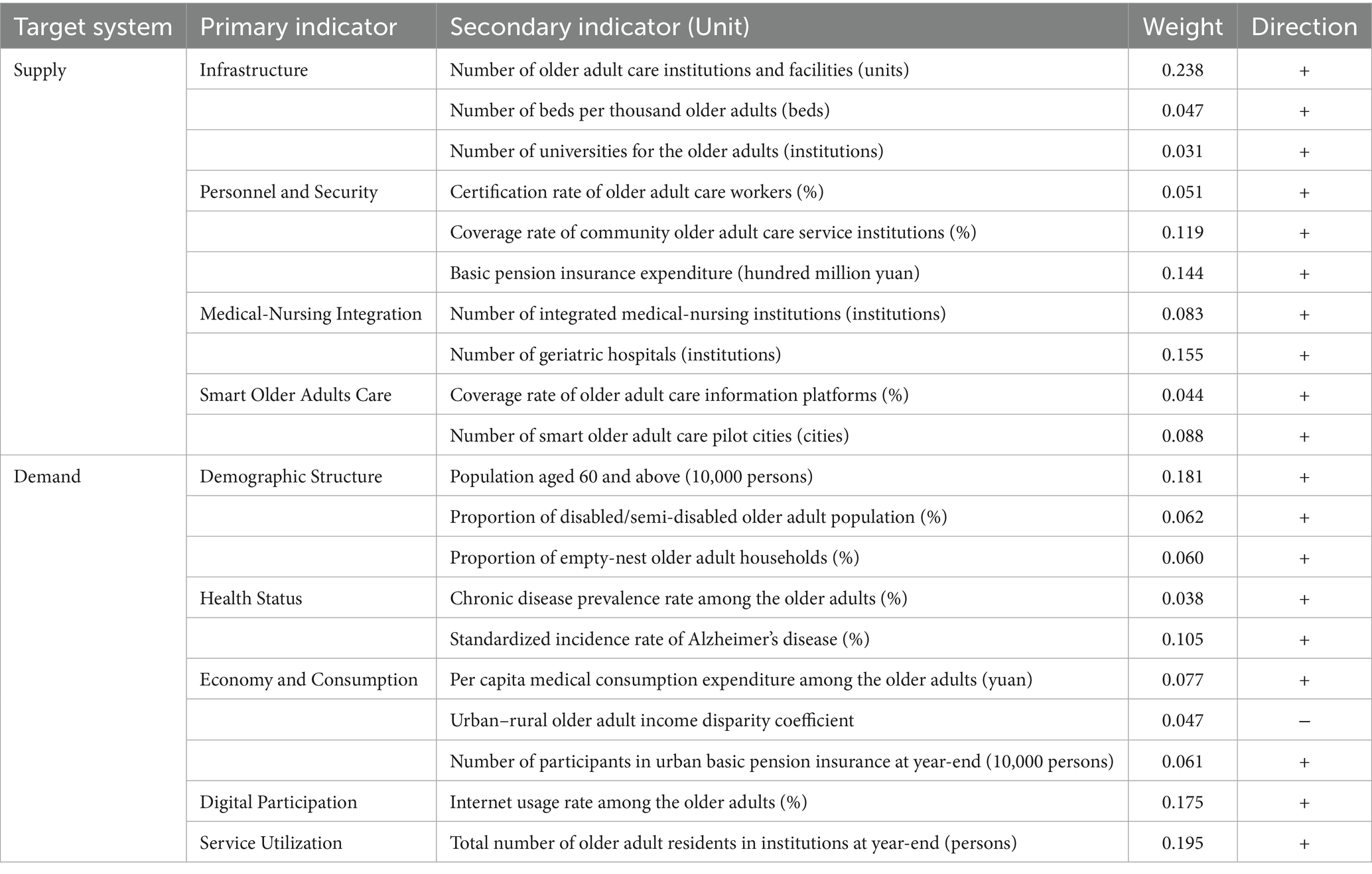Infrastructure serves as the material foundation of older adult care service supply, directly influencing the supply capacity and coverage of older adult care services (26). The number of older adult care institutions and facilities reflects the basic supply scale of older adult care services. The number of beds per thousand older adults represents the per capita allocation level of older adult care service resources and serves as a core indicator for measuring the adequacy of older adult care service supply. The number of universities for older adults not only reflects the supply level of spiritual and cultural older adult care services but also demonstrates the practical implementation of the active aging concept. These three indicators represent the accessibility boundaries of the service system, resource allocation efficiency, and the developmental transformation of service philosophy, respectively.