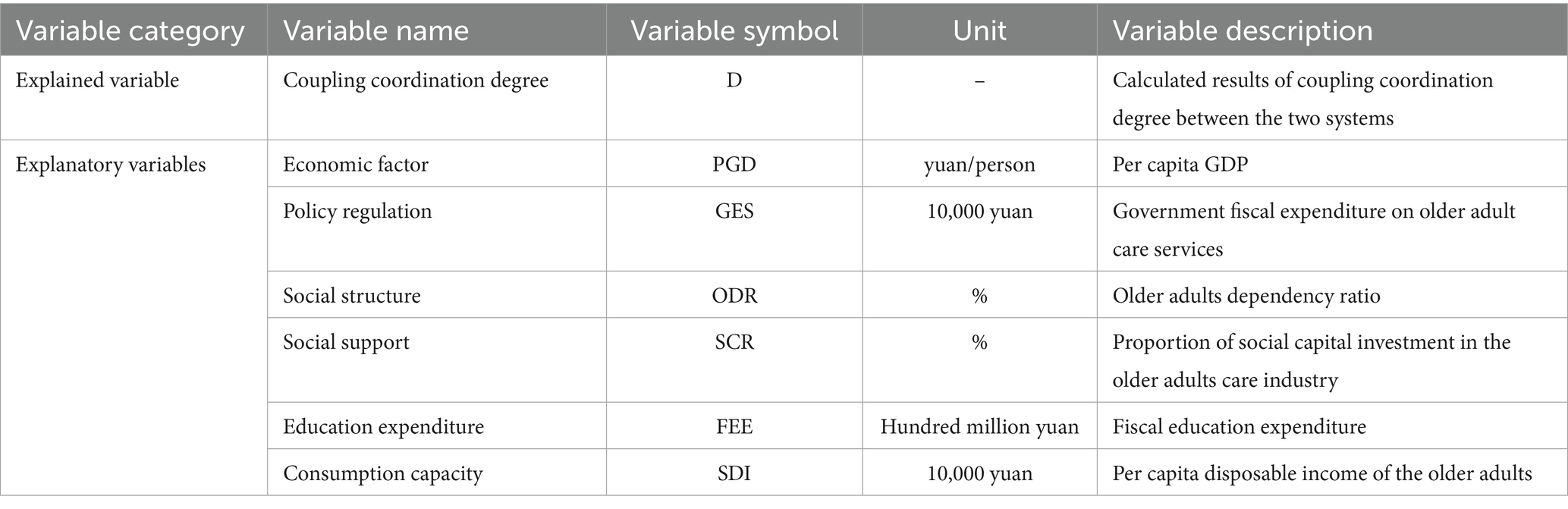 Based on existing research and data availability, as well as the “Several Measures to Promote High-Quality Development of Inclusive Older Adult Care Services” and the “Opinions on Promoting the Construction of Basic Older Adult Care Service Systems,” this study selects key factors that may influence the coupling coordination development of older adult care service supply and demand in China, including economic development level, government support intensity, and sociodemographic structure. Ultimately, per capita GDP, government fiscal expenditure on older adult care services, older adults dependency ratio, proportion of social capital investment in older adult care industry, fiscal education expenditure, and per capita disposable income of older adults were selected as specific analytical variables (Table 2).