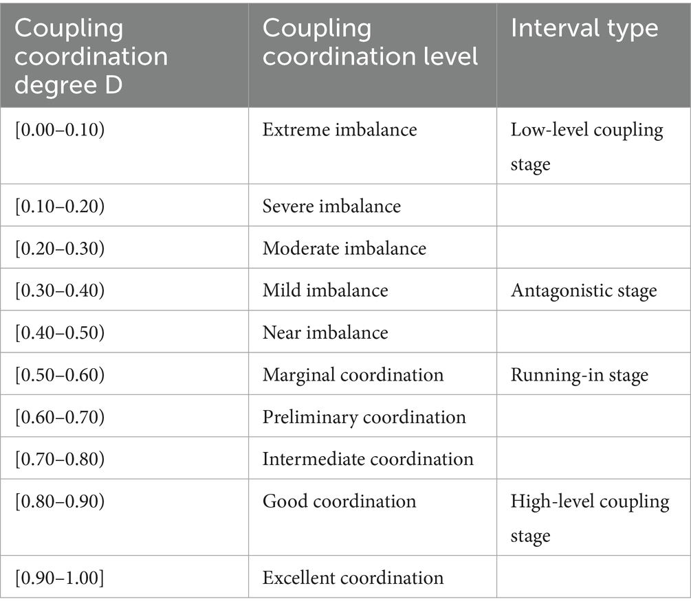 In China’s older adult care service system, the supply system and demand system possess equal importance and influence; therefore, this study sets α = β = 0.5 , ensuring the standardization constraint of α + β = 1 . The values of coupling degree C and coupling coordination degree D are both distributed within the [0,1] interval, where U 1 and U₂, as the comprehensive evaluation scores of the two subsystems, are likewise constrained to the [0,1] range. Higher values of C, D, U 1 , and U 2 indicate higher levels of coordinated development between the two systems. Based on the classification standards of relevant research and combined with the development characteristics of China’s older adult care services, this study categorizes coupling coordination degree into different levels and development stages (Table 3).