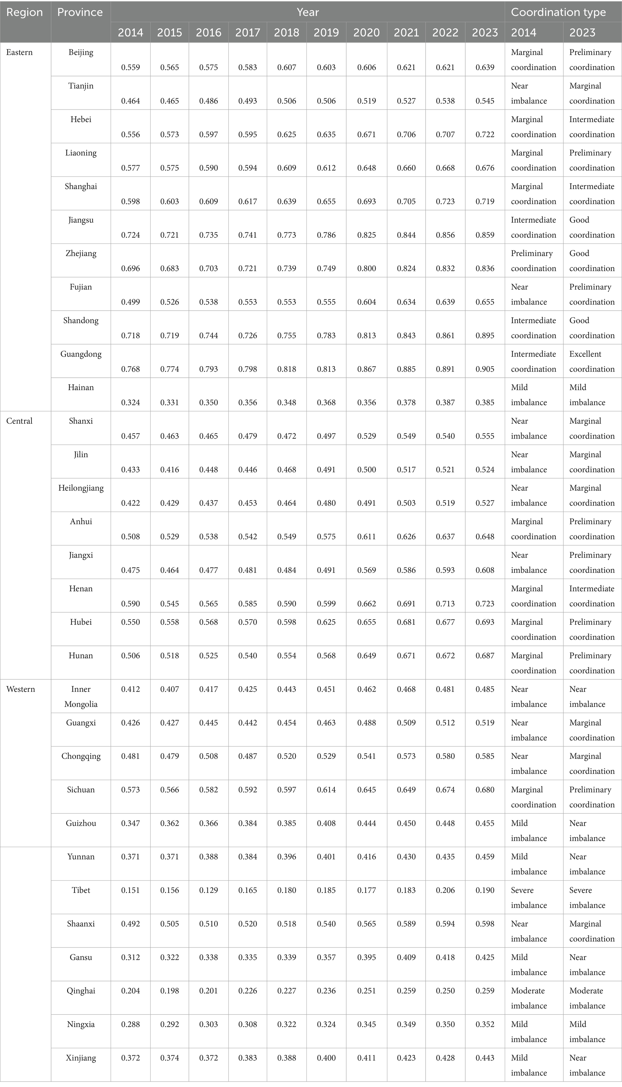 The significant differentiation at the provincial level reflected the long-term accumulation effects of regional development strategies since reform and opening-up. Provinces such as Jiangsu, Zhejiang, Shandong, and Guangdong had already entered preliminary coordination or even good coordination stages. These provinces completed industrialization and urbanization processes relatively early, accumulating substantial economic foundations and comprehensive public service systems. Regional integration policies further strengthened resource agglomeration effects, promoting the formation of older adult care service industry clusters and digital technology application (44). In contrast, the western region’s overall lag stemmed from the superposition of multiple factors. Geographical environmental constraints limited population agglomeration and industrial development, weak transportation infrastructure increased service supply costs, and prolonged positioning in a relatively marginal role in national development strategies resulted in obvious shortcomings in infrastructure and talent reserves. Although the Western Development Strategy had been implemented for many years, the intensity of targeted support in the older adult care service field remained relatively limited. Cultural factors likewise could not be ignored. Family care concepts in western minority regions were more traditional, with lower acceptance of socialized older adult care services, and language and cultural differences also increased service supply difficulty. The central region was in a transitional state, with its east–west connecting geographical advantage not yet fully transformed into older adult care service development advantages, and the problem of aging before becoming affluent caused by sustained labor outflow further intensified supply–demand contradictions.