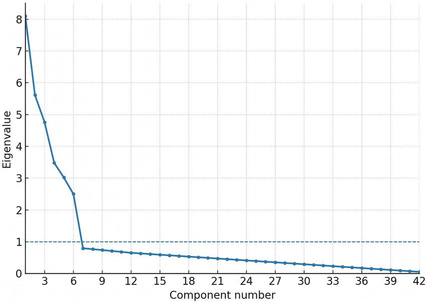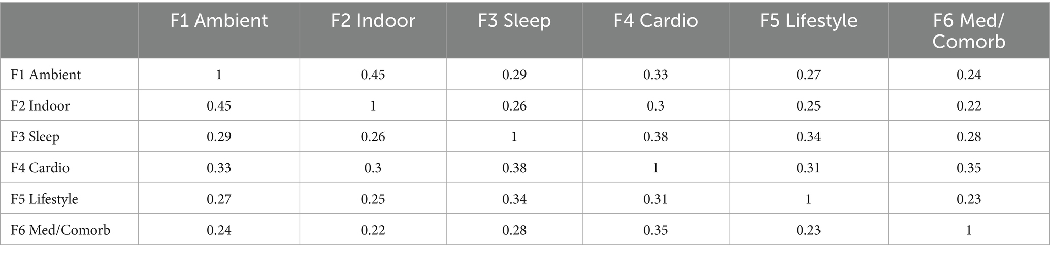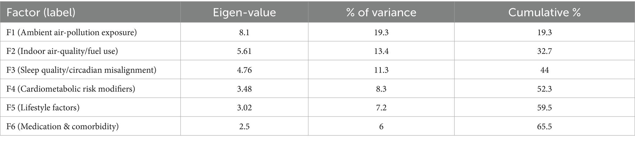 Factorability prerequisites were satisfied (Kaiser–Meyer–Olkin 0.91; Bartlett’s χ2 3,085, df = 861, p < 0.001). In the exploration sample (n = 230), exploratory factor analysis (principal-axis, promax) recovered six factors with eigen-values > 1.0, together explaining 66.1% of total variance. The first three factors were labelled ambient air-pollution, indoor air-quality/fuel use, and sleep quality; eigen-values were 8.10 (19.3%), 5.61 (13.4%), and 4.76 (11.3%), respectively, with the remaining factors (cardiometabolic risk modifiers, lifestyle, medication/comorbidity) contributing 3.48 (8.3%), 3.02 (7.2%), and 2.50 (6.0%) (see Table 3). Primary loadings ≥ 0.40 were observed for 41/42 items; a single sleep-maintenance item (night-time bathroom visits) loaded at 0.39 and was retained for clinical relevance (see Table 4). The scree plot is shown in Figure 1. Confirmatory factor analysis in the validation sample (n = 230) showed excellent fit (χ2/df 2.19; CFI 0.965; TLI 0.958; RMSEA 0.041, 90% CI 0.036–0.047; SRMR 0.052). Standardised latent-factor correlations ranged from 0.22 to 0.45, consistent with related but non-redundant constructs (see Tables 5, 6).